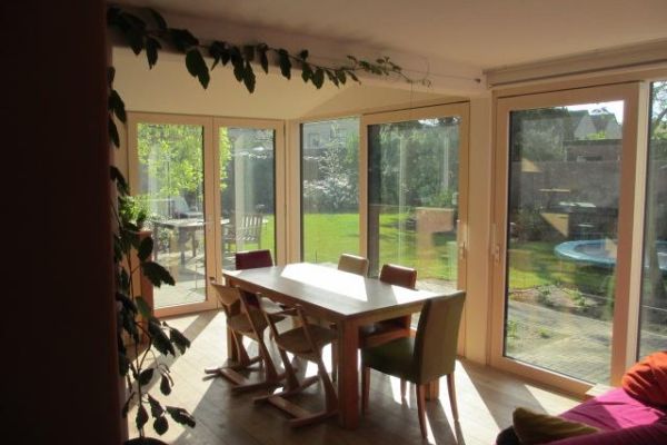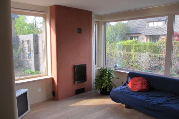 We hebben het huis in het najaar 2012 gekocht. Het is een twee onder één kap uit 1971. In april 2013 zijn we gestart met de verbouwing. Een deel van de werkzaamheden hebben we zelf uitgevoerd. Het huis heeft nu energielabel A++. Voor de verbouwing was dit energielabel G. We hebben gekozen voor driedubbel glas, met optimaal daglichtgebruik en zoveel mogelijk glas op het zuiden. Hierdoor maken we gebruik van de zonnewarmte op koudere dagen. Verder hebben we leemstuc op de muren. Leem zorgt voor een stabiele vochthuishouding en een aangenaam klimaat. Bij vochtig weer nemen de wanden vocht op, bij droog weer komt dit vocht weer vrij. De wandverwarming hebben we in de leem verwerkt. Hierdoor ontstaat warmtestraling, wat prettig aanvoelt. De leemkachel is een massief stenen hoogrendementskachel met een buitenmantel van leemstenen. Verder hebben we zoveel mogelijk geïsoleerd met natuurlijke materialen zoals houtvezelplaten voor de wanden, vlas en hennep op zolder. De ventilatie is geregeld via natuurlijke aanvoer en mechanische afvoer. De afvoer wordt gestuurd door een Co2 meter. De spouwmuur is geïsoleerd met HR++ Termoparels. We hebben twaalf zonnepanelen met een jaarlijkse opbrengst van ongeveer 2800Kwh. Op termijn willen we gebruik maken van natuurlijke zonwering. Bij de eigen werkzaamheden zijn we begeleid door een architect (Region lab) en de “groene bouwmaterialen”. Dit omdat we zelf niet voldoende kennis hadden om het alleen uit te voeren. Een deel van de verbouwing hebben we kunnen uitvoeren door subsidie van het vlagheide fonds.