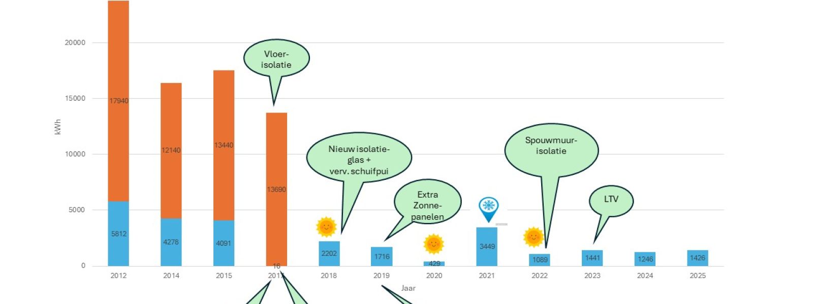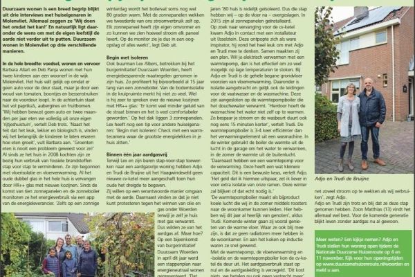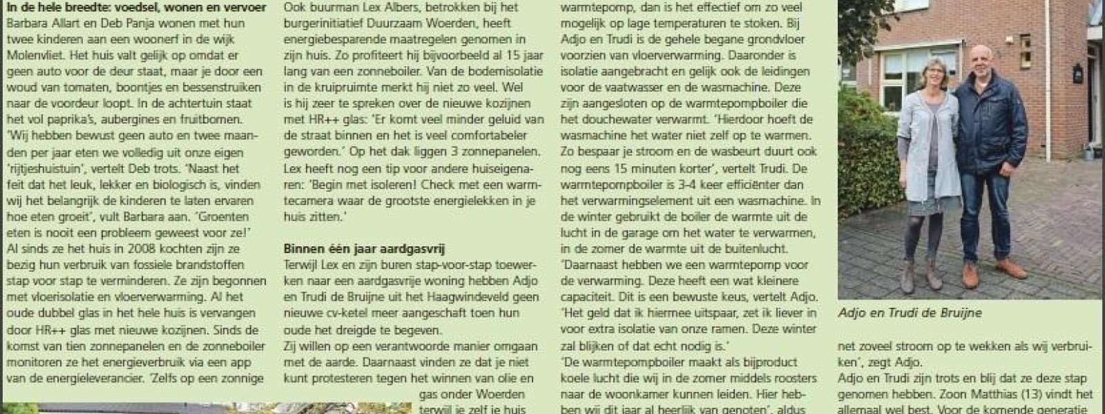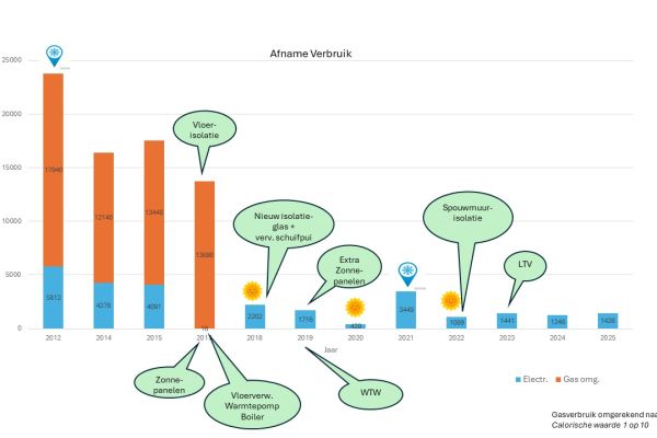 Vanaf begin 2016 zijn we bezig onze woning aan te passen naar een nul-op-de-meter-woning.We worden hierbij gemotiveerd door onze overtuiging dat we als Christenen een verantwoordelijkheid hebben om zuinig op onze schepping te zijn. Ook zijn we er van overtuigd dat we rigoureuze aanpassingen in ons leven moeten doen om verdere opwarming van de aarde te voorkomen. Tenslotte vonden we als Woerdenaren dat we niet kunnen protesteren tegen eventuele exploitatie van de gasvoorraad onder onze woonplaats maar tegelijkertijd wel doorgaan met verstoken van Gronings gas.De eerste stap was het aanbrengen van zonnepanelen om een belangrijk deel van de stroom zelf op te wekken. Na plaatsing zijn we nog kritischer gaan kijken naar de grote verbruikers en is een nieuwe koelkast aangeschaft en veelgebruikte verlichting vervangen door led’s.De volgende stap was de afkoppeling van de gas-aansluiting. Dit had meer consequenties, het gasfornuis moest vervangen, vloerverwarming moest worden aangebracht en de isolatie van de vloer worden verbeterd. Al met al een hele operatie die in oktober 2017 is afgerond.Zie bij foto’s hieronder voor een overzicht van de significante afname van het verbruik sinds 2012.