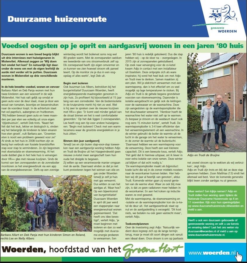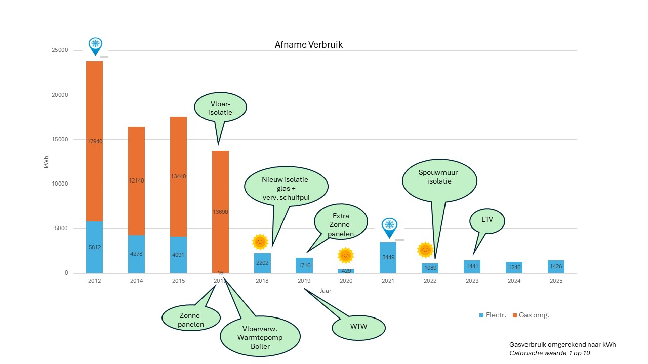 Vanaf begin 2016 zijn we bezig onze woning aan te passen naar een nul-op-de-meter-woning.We worden hierbij gemotiveerd door onze overtuiging dat we als Christenen een verantwoordelijkheid hebben om zuinig op onze schepping te zijn. Ook zijn we er van overtuigd dat we rigoureuze aanpassingen in ons leven moeten doen om verdere opwarming van de aarde te voorkomen. Tenslotte vonden we als Woerdenaren dat we niet kunnen protesteren tegen eventuele exploitatie van de gasvoorraad onder onze woonplaats maar tegelijkertijd wel doorgaan met verstoken van Gronings gas.De eerste stap was het aanbrengen van zonnepanelen om een belangrijk deel van de stroom zelf op te wekken. Na plaatsing zijn we nog kritischer gaan kijken naar de grote verbruikers en is een nieuwe koelkast aangeschaft en veelgebruikte verlichting vervangen door led’s.De volgende stap was de afkoppeling van de gas-aansluiting. Dit had meer consequenties, het gasfornuis moest vervangen, vloerverwarming moest worden aangebracht en de isolatie van de vloer worden verbeterd. Al met al een hele operatie die in oktober 2017 is afgerond.Zie bij foto’s hieronder voor een overzicht van de significante afname van het verbruik sinds 2012.
