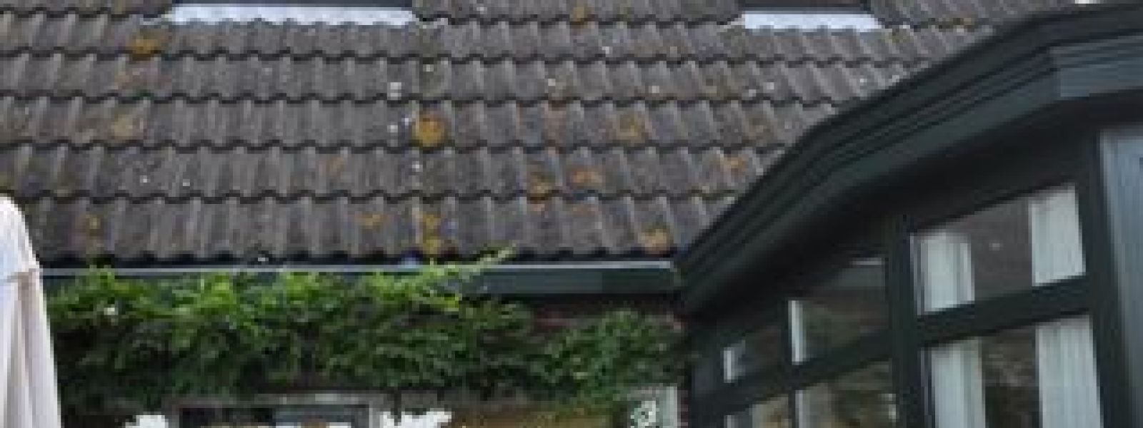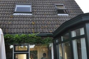 Twee-onder-een-kap woning met aangebouwde serre en verbouwde garage met verlengd dak over de entree.