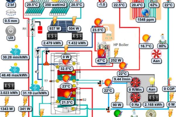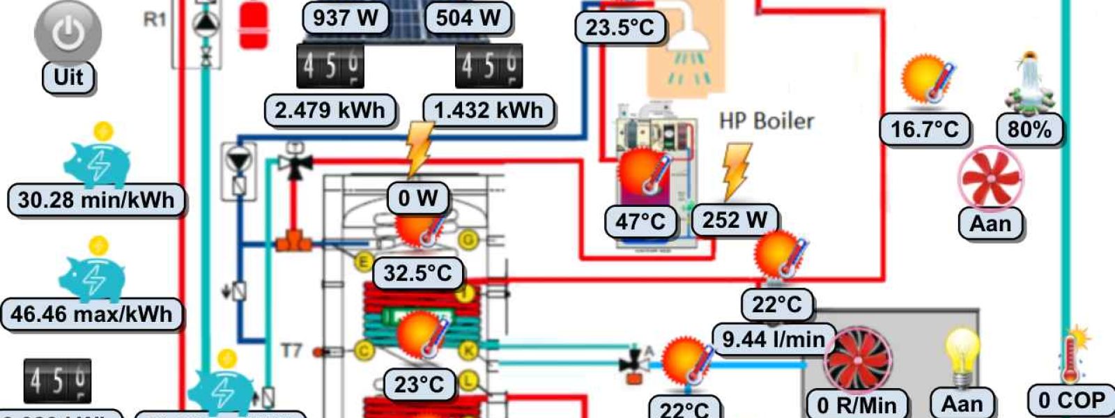 We hebben een extra warmtepomp boiler geïnstalleerd voor warmwater, welke gebruikt wordt om het water van de heatpipes na te verwarmen indien nodig, om zo extra energie te besparen zodat de gewone warmtepomp alleen voor de vloerverwarming gebruikt kan worden.