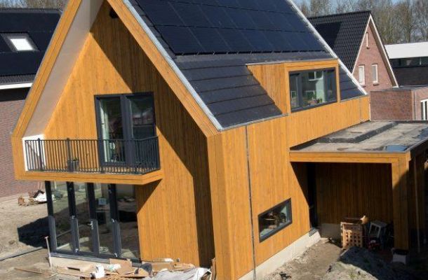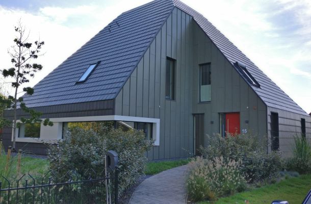De woning wordt verwarmd door vloerverwarming en een warmtepomp met zonnepanelen.