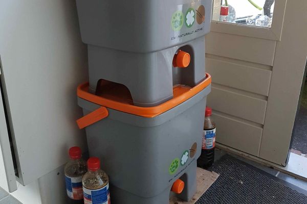 Onze tuin was weiland en is nu tuin op basis van de uitgangspunten van perma-cultuur. Het is nog in opbouw, maar we hebben al ruim drie jaar geen groencontainer meer aan de weg gezet. Alles, ook keukenafval, verwerken we zelf middels composteren en Bokashi. In de tuin ook een zwemvijver en kikkerpoel. We vangen regenwater op in regentonnen.