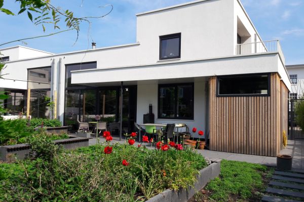 Deze woning all-electric woning is voorzien van zeer hoge isolatie in wand, vloer en dak, met als bijzonderheid dat voor- en achtergevel zijn opgebouwd uit prefab stro-elementen met een Rc van 8.4, die aan de binnenkant zijn afgewerkt met leemstuc. In verwarming en warm water wordt voorzien door een lucht-water warmtepomp waarvoor de energie geleverd wordt door 25 PV cellen die onzichtbaar op het plattedak liggen. Met deze zonnepanelen wordt ook in de overig benodigde energie voorzien.