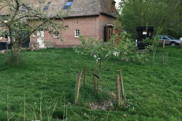 Ons erf en weiland is ingericht met behulp van advies van het Drents Landschap (boerenerven cursus) en Landschapsbeheer Drenthe (o.a. singel en overige beplanting), maar nog volop in ontwikkeling. Naast een lange singel met autochtoon plantgoed, een kleine moestuin en een boomgaard hebben wij een stuk weiland waar we voor het maaien en vermaak met regelmaat koeien of schapen uit de buurt op hebben staan. Een deel van het weiland is in 2019 met veel succes ingezaaid als vogelakker, in 2020 is dit stuk opnieuw in gebruik als vogelakker met een grote diversiteit aan bloemen. We hebben zowel voor in de boomgaard als achter op het land kippen lopen.