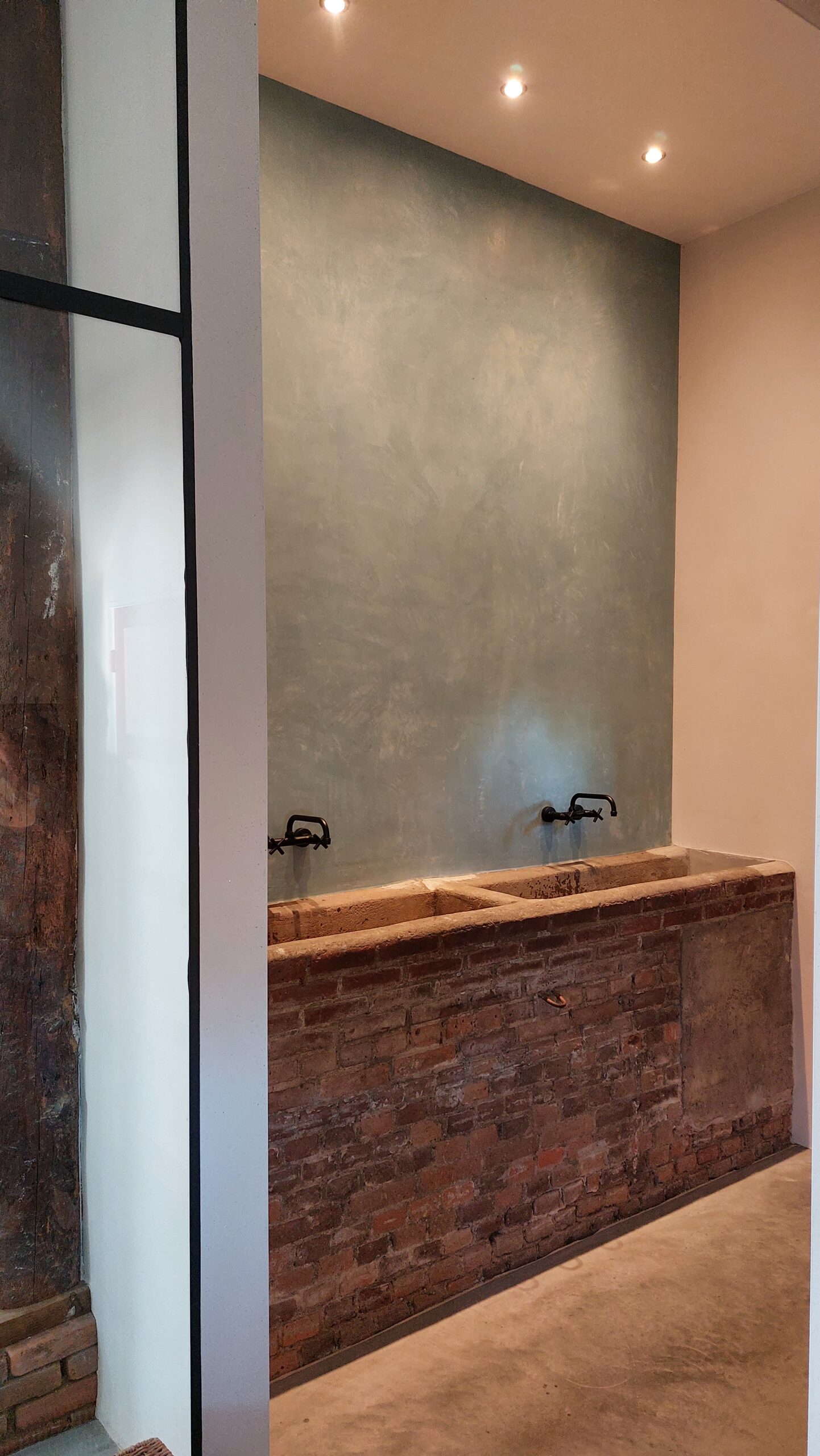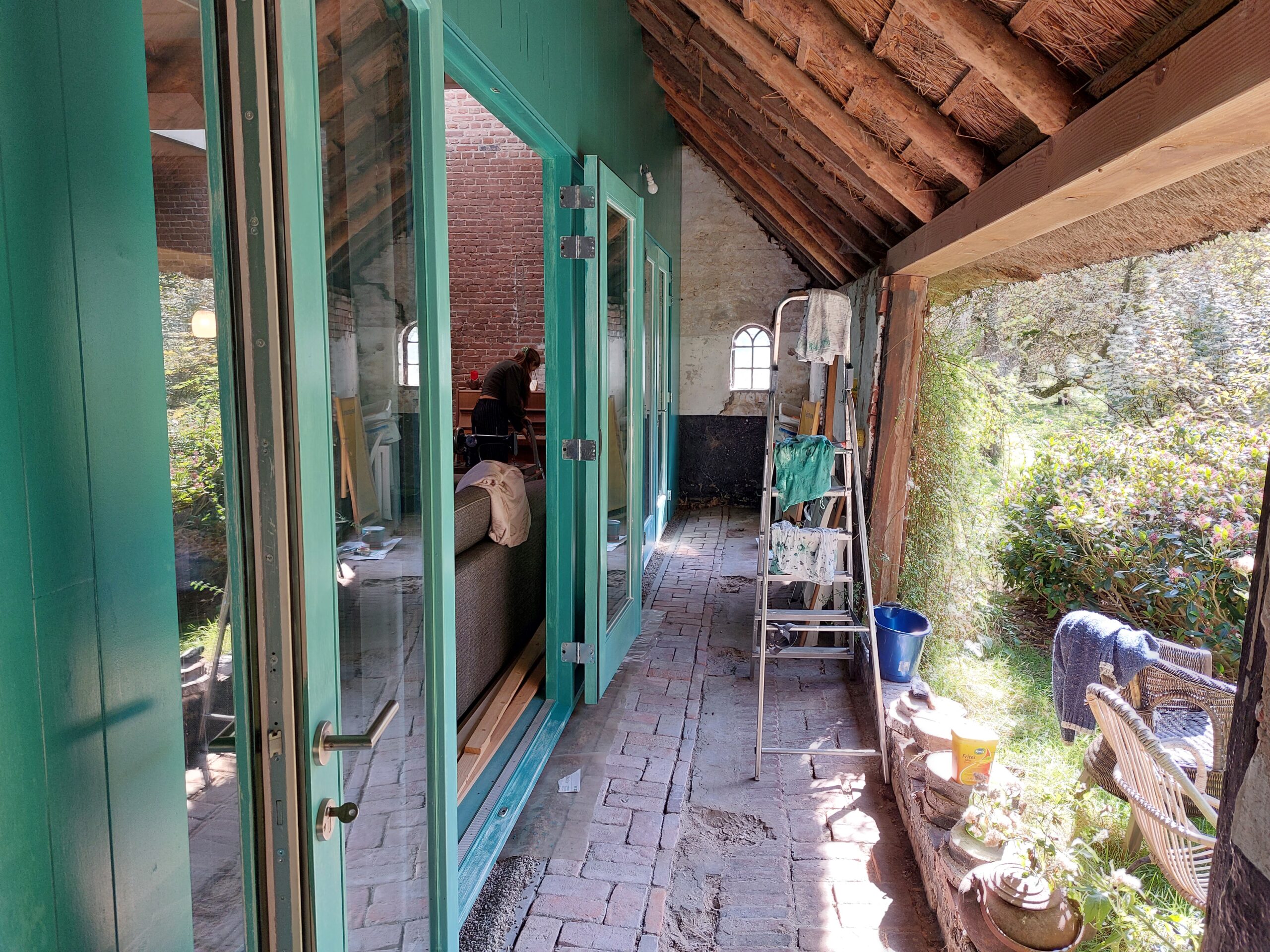 Duurzaam strevenMomenteel restaureert het echtpaar de ingezwenkte lijstgevel en de raamkozijnen aan de voorzijde van het huis. Hiervoor wordt lijnolieverf gebruikt, als duurzame variant. Het illustreert de wijze waarop Wouter en Marian te werk gaan. De karakteristieke uitstraling wordt zoveel mogelijk behouden en daaraan worden nieuwe, duurzame maatregelen toegevoegd. Zo wordt er leemstuc gebruikt, niet enkel voor een mooie uitstraling, maar ook omdat het een natuurlijk materiaal is dat ademt. Daarnaast wordt er dampopen geïsoleerd, zonder gebruik te maken van glas- of steenwol.