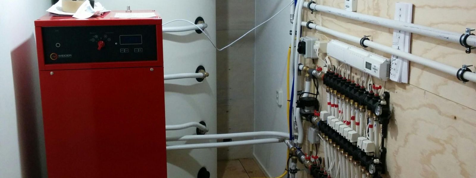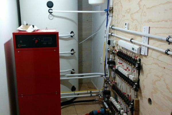 Een warmtepomp met gesloten bron en een buffervat van 800 liter voor vloerverwarming en warm water en er liggen 27 zonnepanelen op het dak.
