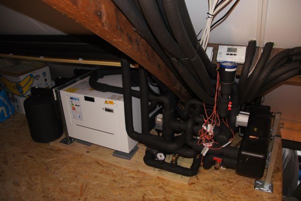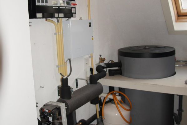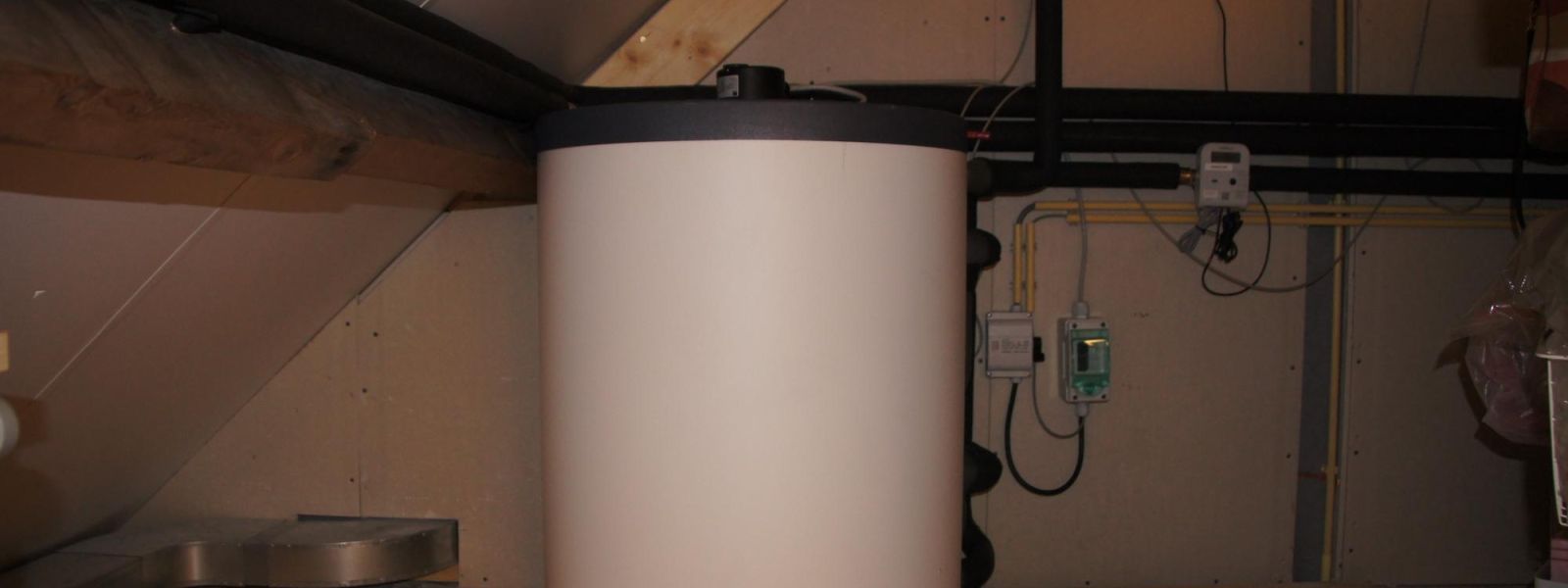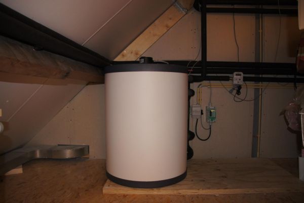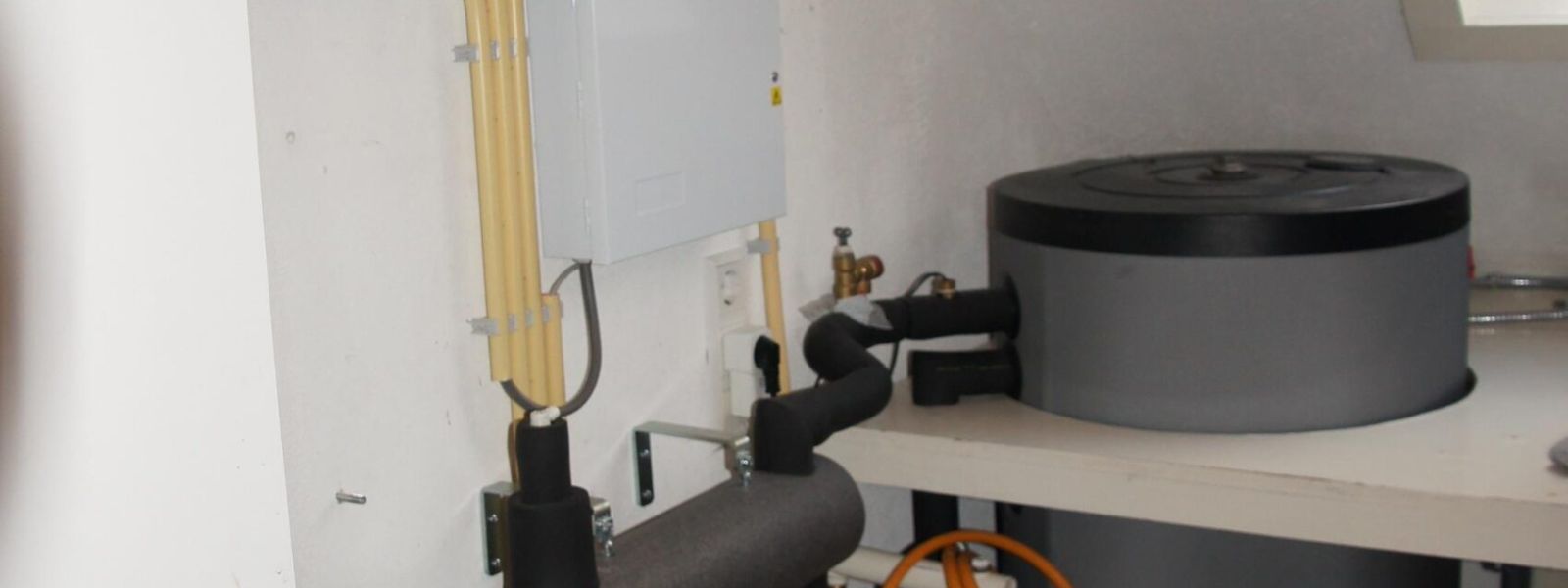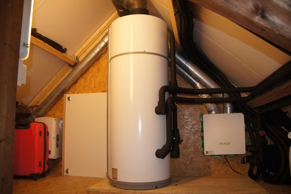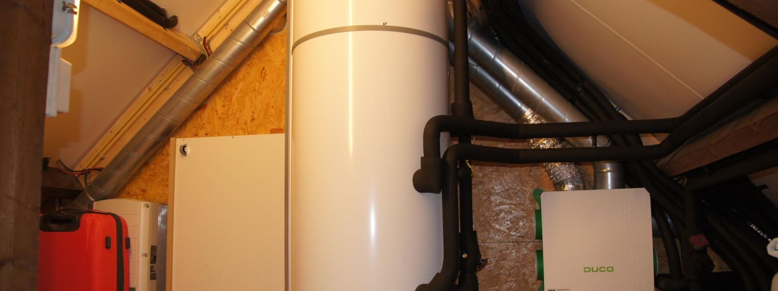 Nibe Ventilatie lucht warmtepomp boiler als WTW en backup voor tapwater. Gebruikt overtollige warme lucht van 1e etage die afgezogen wordt.
