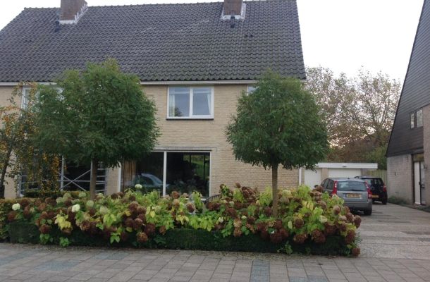 Serre geplaatst bij keuken en zuidelijk woonkamer als buffer tegen wind en hitte in zomer.