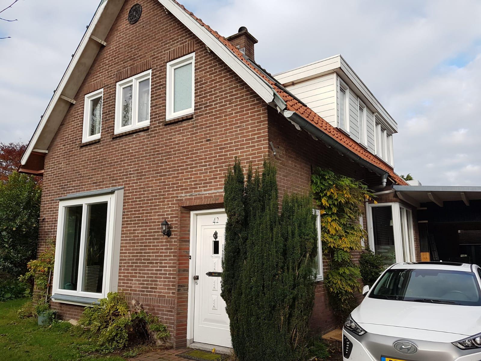 De maatregelen op een rij: In het huis is alles geisoleerd, vloerverwarming, triple glas, zonnepanelen en all electric warmtepomp. Projecten: zolder isoleren, kozijnen vervangen, zonneschermen plaatsen (tegen hitte), regenwater afkoppelen, natuurlijke materialen (hennep, kalkhennep, metisse (gerecycled katoen)), Houtskeletbouw, bouwen zonder beton (schroeffundering voor garage), warmtepomp, vloerverwarming en zonnepanelen.Ons huis uit 1925 is sinds 2018 van het gas af. Stap voor stap hebben we bij onderhoud nagedacht over isolatie. We hebben zo veel mogelijk zelf gedaan.In november 2012 hebben we het huis gekocht. Vanwege kou en tocht eerst het enkel glas in de keuken en de boven verdieping vervangen door nieuwe kozijnen te plaatsen met isolatie glas. In de gang en wc hebben we 2e hands dubbel glas – glas in lood ramen geplaatst: dat geeft de uitstraling behorend bij een jaren 30 woning en houdt toch de warmte binnen.In de eerste winter hebben we de spouwmuur laten isoleren: dat scheelt heel veel tocht langs de kozijnen en verdiend zich binnen een paar jaar terug op de gasrekening.We zijn toen begonnen met het isoleren van het dak. De slaapkamers bevinden zich onder het schuine dak, dus er was veel kou in de winter en hitte in de zomer. In de achterkamers hebben we PIR platen tussen de balken geplaatst met klimaatfolie om vocht problemen uit te sluiten. In de voorkamer hebben we later gekozen voor een milieuvriendelijk materiaal: hennep isolatie. Dat geeft betere geluidsisolatie en blijkt heel fijn te zijn voor het binnenklimaat. Doordat het een dampopen isolatie is wordt de luchtvochtigheid natuurlijk gereguleerd. En hennep isolatie is erg fijn materiaal om mee te werken: het geeft geen irritatie aan huid of luchtwegen.In de zomer van 2017 hebben we de vloer van de beneden verdieping aangepakt. Het was een oude houten, tochtige vloer. De houten vloer hebben we eruit gehaald; we konden gelijk de gemetselde fundering verstevigen waar we zwakke plekken aantroffen. 20 cm PIR op het zand gelegd (met folie ertussen) voor echt een warme vloer. Vervolgens vloerisolatie aangelegd en een betonnen vloer gestort. Om het gewicht op de oude fundering zoveel mogelijk te ontlasten hebben we de betonnen vloer dun gehouden en met vezels versterkt. We hebben ook geen aparte dekvloer gebruikt, maar de houten vloer op het beton gelegd.Tot slot de laatste oude kozijnen vervangen door triple glas. Ondertussen was de gasrekening van 2000 kuub per jaar naar minder dan 1000 kuub per jaar gezakt. Voldoende om de ketel te vervangen door een 7,7 kW warmtepomp met een 190 liter boilervat erin voor tapwater, en een 50 liter buffer voor de vloerverwarming. De 19 zonnepanelen wekken voldoende op om ons stroomverbruik te compenseren: de warmtepomp verbruikt 3000 kWh per jaar, en ons stroomverbruik voor de rest is 2250 kWh. We zijn dus nul op de meter geworden! En hebben nu een heerlijk warm en comfortabel huis, we zijn klaar voor de toekomst.We zijn nu ook aan het verbouwen met duurzame/biobased materialen. Onze natuurlijke garage in aanbouw is te bezichtigen! En daarnaast gaan we volgend jaar het regenwater ontkoppelen. We vangen al veel water op met 4 regentonnen, en vullen dat aan met een groen dak op de nieuwe garage en een wadi op de plek van de oude garage.