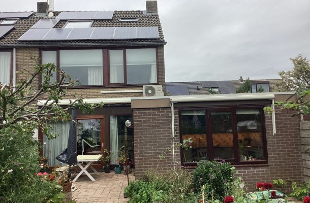 Het was een dijkwoning een arbeiders woning gebouwd in 1928 met waterput gasverlichting en bedsteden. 8 m x 5,5 m en open zolder. 44m2. Wij kochten het vrijstaand huis voor 35.000 gulden in 1972 toen hebben we naar achteren een aanbouw gemaakt met slaapkamer beneden douche en toilet en hal. Het huis werd toen 80 m2Begin van het energiebeleid.In 1980 hebben wij dubbelglas geplaatst en een houtkachel aangebracht. in 1981 in de levensmiddelenzaak bedacht ik een warmteterugwin boiler, om de koelinstallatie het freongas de warmte terug te winnen. In 1981 een windmolen op het platte dak. In 1983 rolluiken. Het was destijds van de energiezuinige jampot lampen. In 1982 spouw geisoleerd.In 1984 de levensmiddelenzaak gesloten.In 1988 de grote verbouwing van 80 m2 naar 120 m2 , boven 6 slaapkamers , en een kruipzolder van 80 m2, Woonkamer met open eetkeuken 60 m2 en begane grond een garage grote hal en toilet. De fundeering van lichtgewicht beton (breston), het dak is van unidekplaten, met dakoppervlak van 110 m2.In 1990 zonnecollectoren 10 m2 en 500 liter boiler geplaatst. De wasmachine werkt op boiler warmwater besturing.In 1999 de eerste12 zonnepanelen geplaatst.in 2000 de buitengevel geïsoleerd met hoge isolatiewaarde platen en afgewerkt met steenstrips.In 2003 16 zonnepanelen erbij geplaatst.In 2013 een lucht/water warmtepomp geplaatst. Die verwarmd de boiler / en de cv-installatie