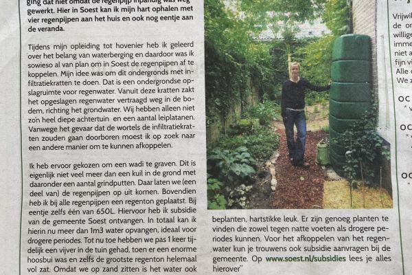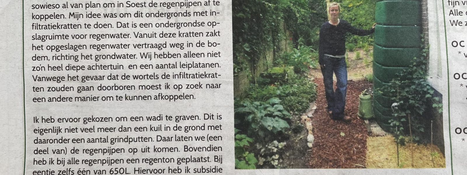 Wij hebben begin 2021 ons nieuwbouwhuis in Utrecht verruild voor een jaren ’30 woning in Soest. Een behoorlijke omschakeling waar we echt wel even aan moeten wennen. We hebben twee regenpijpen aan de woning losgekoppeld van het riool en een wadi aangelegd. Ook hebben we behoorlijk wat bovengrondse wateropslag in regentonnen. Ik heb zelf een hoveniersopleiding gedaan en vertel graag over mijn ervaringen met waterberging in de tuin.