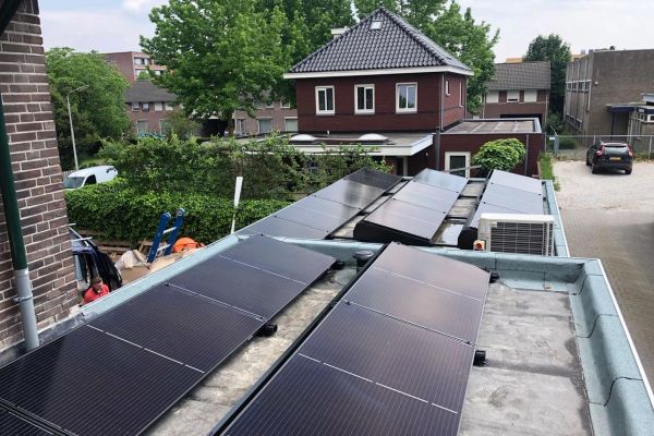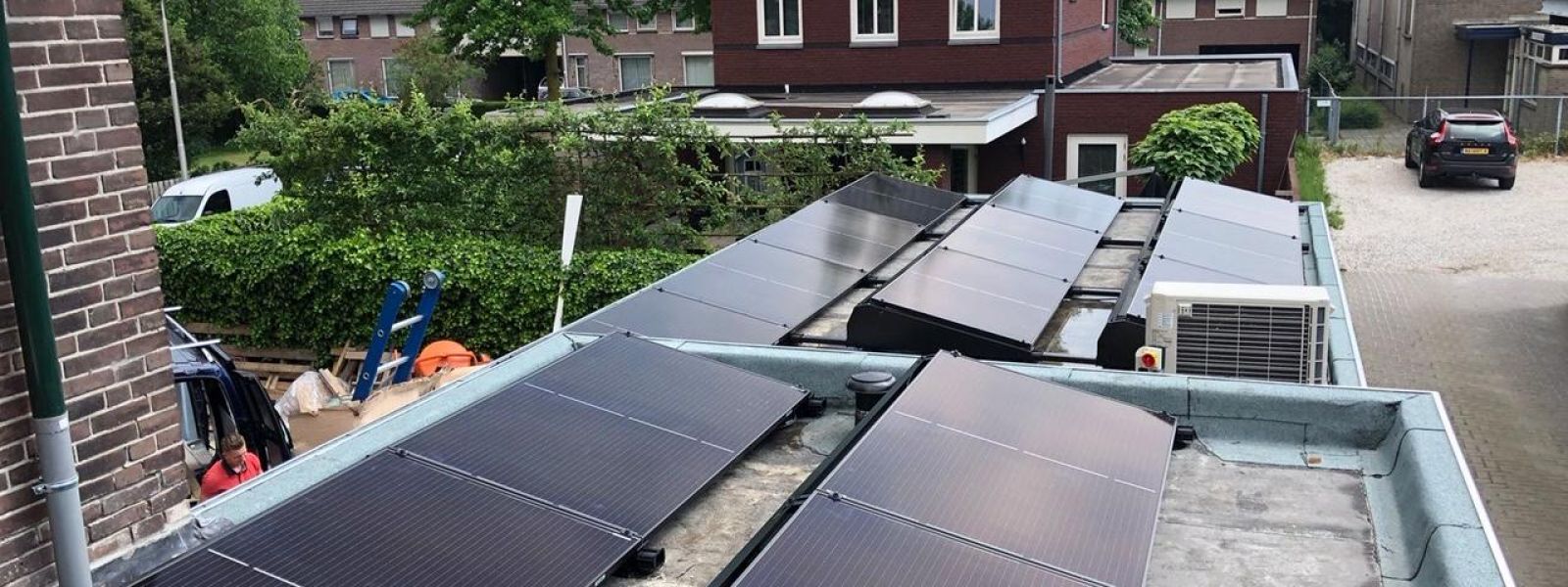 16 PV zonnepanelen à 310 Wp op het platte dak van de uitbouw.