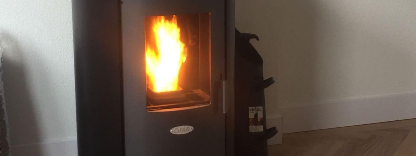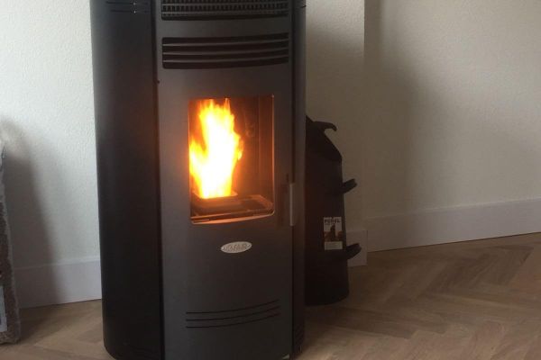Pelletkachel in woonkamer om snel te kunnen bijverwarmen wanneer nodig.