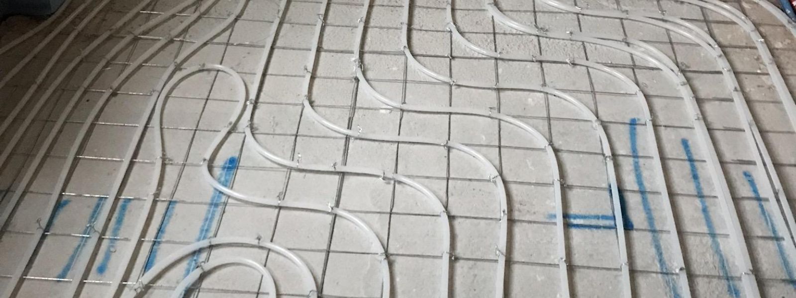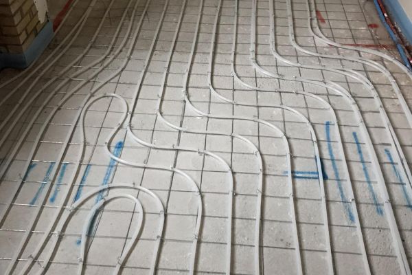 Lucht/water warmtepomp voor vloerkoeling- en verwarming begane grond, geregeld met master-master in 3 zones.