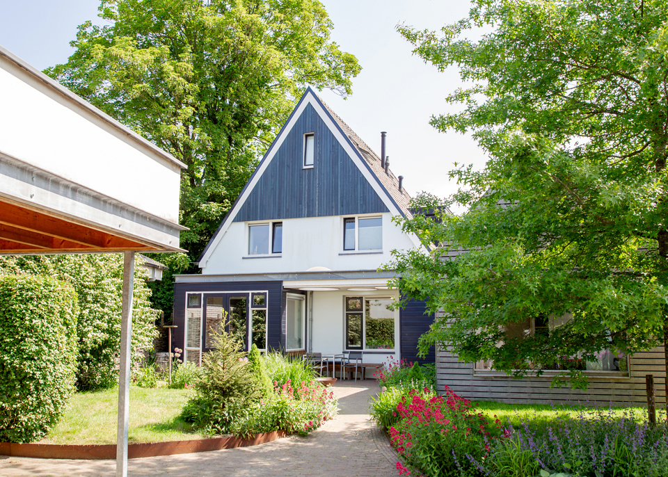 We verhuisden in 2013 verhuizen naar Geldermalsen. Dit huis stond te koop, het was slecht onderhouden. We hebben kort rondgelopen en toen snel besloten om het te kopen. Mooie plek in het dorp, karakteristiek huis en een grote tuin met mogelijkheden voor werken aan huis. We lieten de oude schuurtjes slopen, de asbest verwijderen, de grond saneren (olieresten) en ondertussen maakten we plannen voor het huis. Het dak werd voorzien van isolatieplaten en daarop de oorsponkelijke dakpannen, de meeste kozijnen werden vervangen.