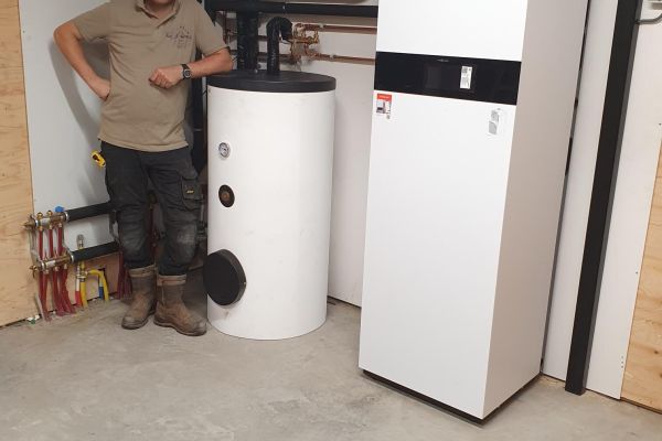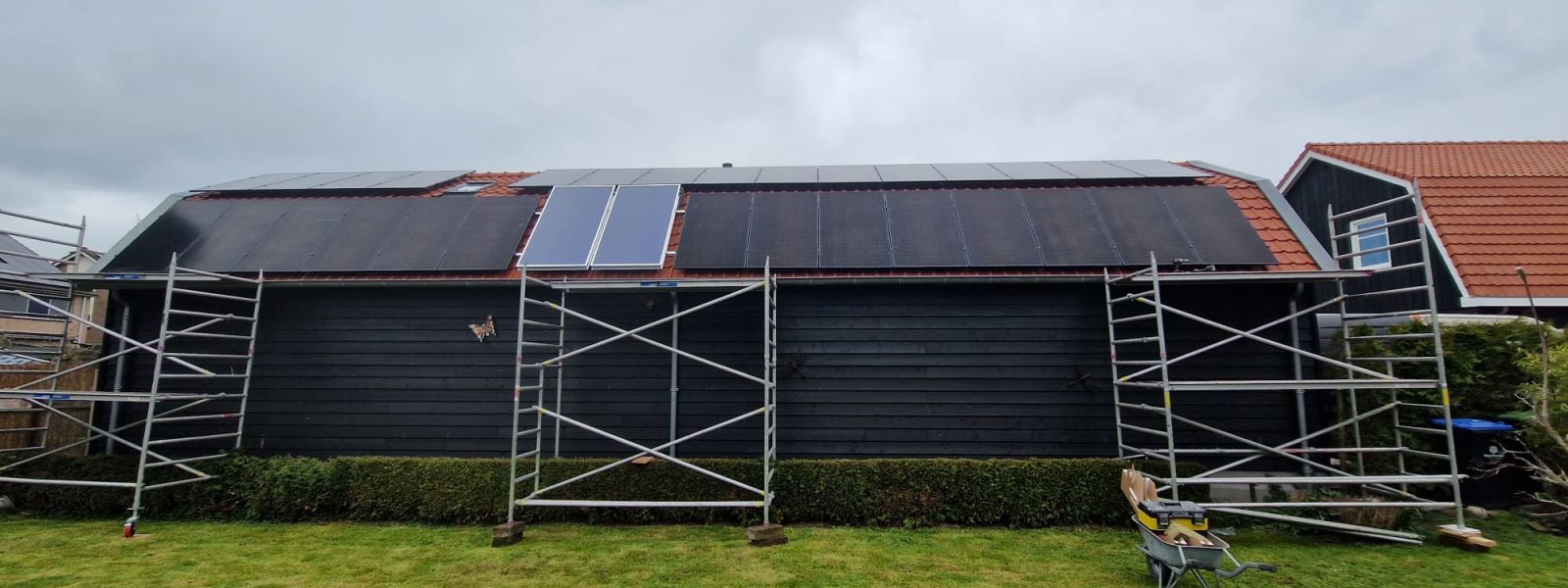 Hybride warmtepomp. En in de schuur hebben we een full electric warmtepomp en een zonneboiler. Op het dak liggen 29 zonnepanelen en 2 zonnecollectoren. Ook hebben we een wtw-installatie.