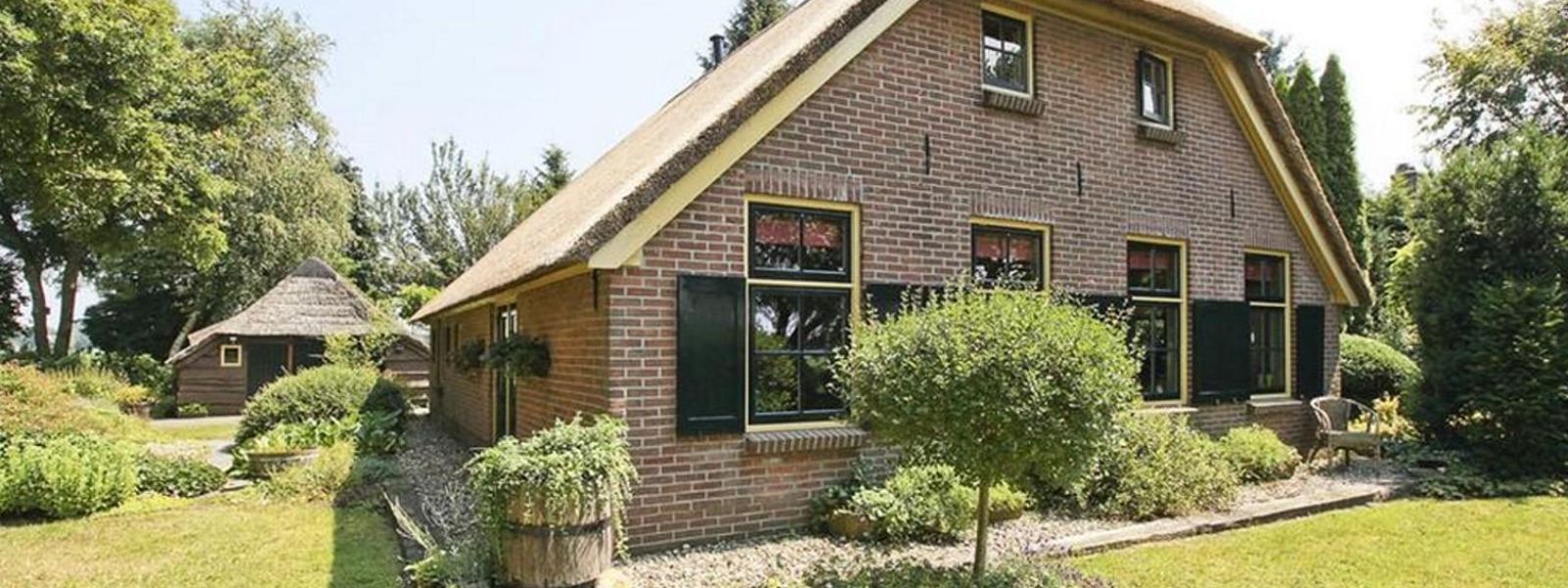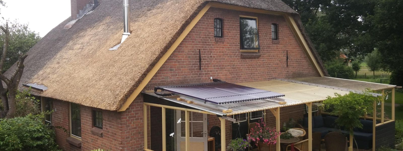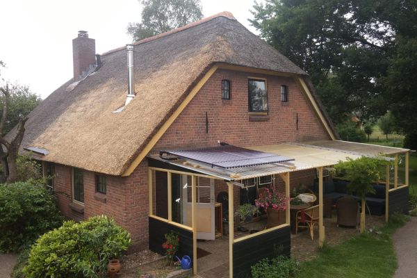 Rietgedekte boerderijwoning met bijgebouwen, verbouwd, nageisoleerd in jaren 90 en door ons sinds 2015 voorzien van zonnepanelen, biomassa CV, zone-regeling, heatpipes. Bijna gasloos.