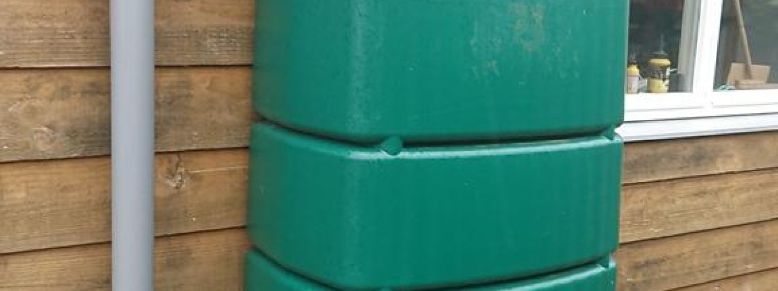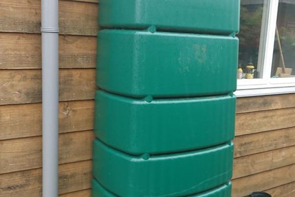 Regenwater wordt tijdelijk opgeslagen in 3 grote regentonnen, waarna het langzaam in de tuin stroomt.