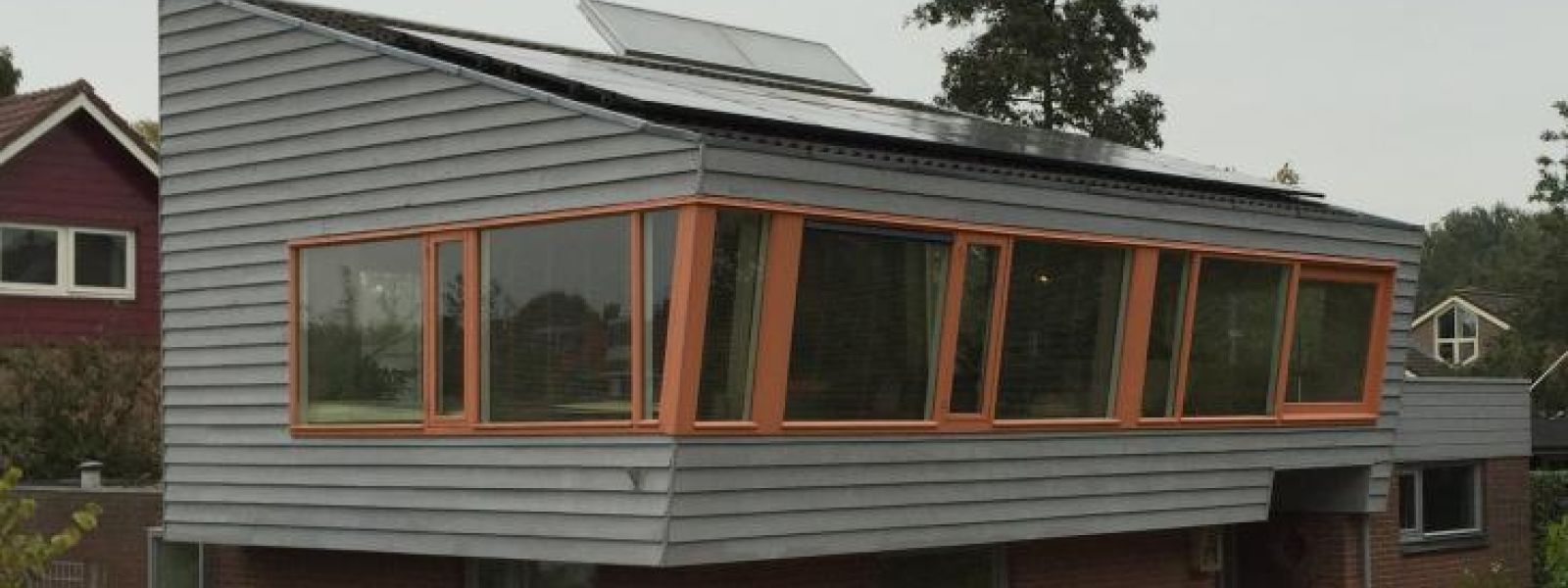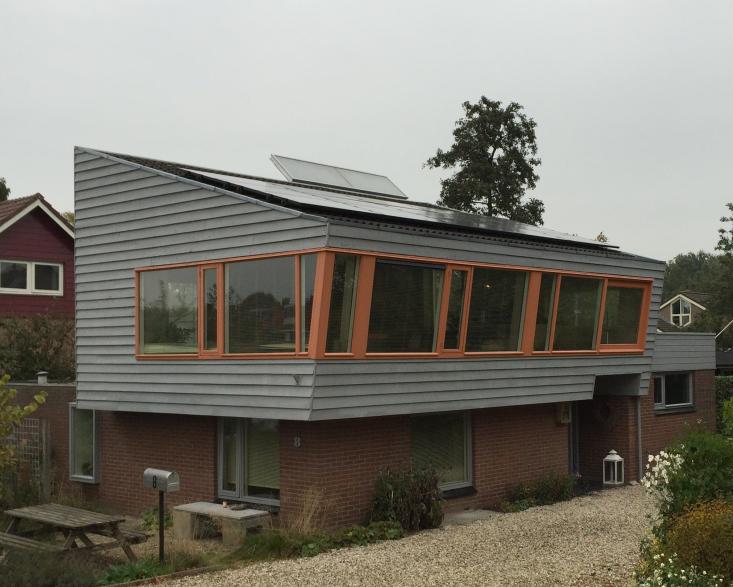 Onze woning is een vrijstaande woning (700m3) van het type semibungalow en bestaat in feite uit drie samengevoegde delen uit verschillende bouwjaren: woondeel 1975 en keukendeel 2004 en recent gebouwd slaapdeel 2019.. De architectuur is opvallend, met name het deel uit de jaren zeventig. Na aankoop 1997 grondig aangepakt ivm matige kwaliteit. In de loop der jaren voortdurend energiebesparende maatregelen (isolatie, HR++-glas) toegepast en recent voorzien van zonnepanelen, een zonneboiler (gebruikte) en hybride warmtepomp. Op weg naar energieneutraal! Platte daken voorzien van groendak (2020). Scheiding afvalstromen.