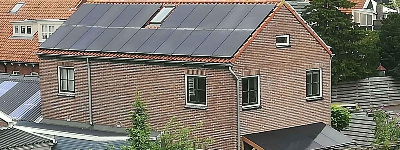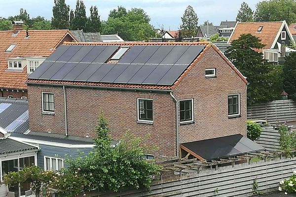 Zonnepanelen op de schuur aan beide zijde, een afdak met zonnepanelen en op het tuinhuis. Lucht-water warmtepomp R29, thuis accu van 25KW, elektrische auto, nul op de meter en CO2 regeling voor de ventilatie