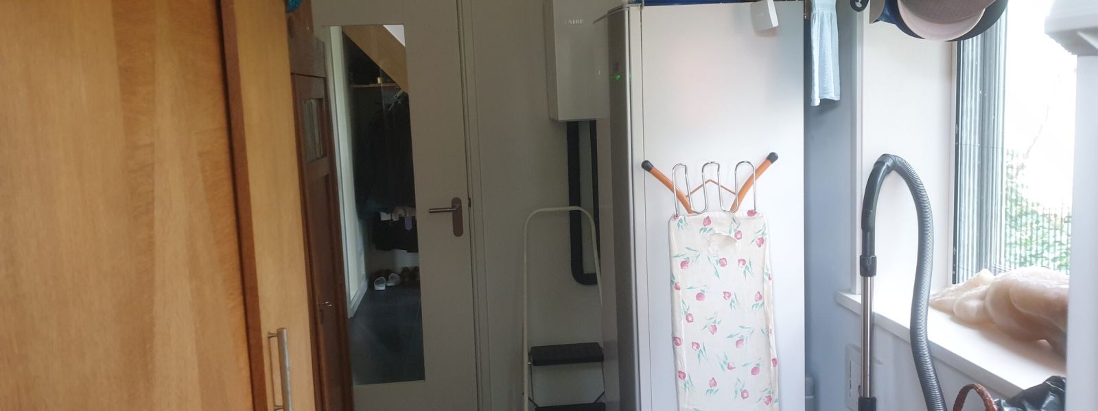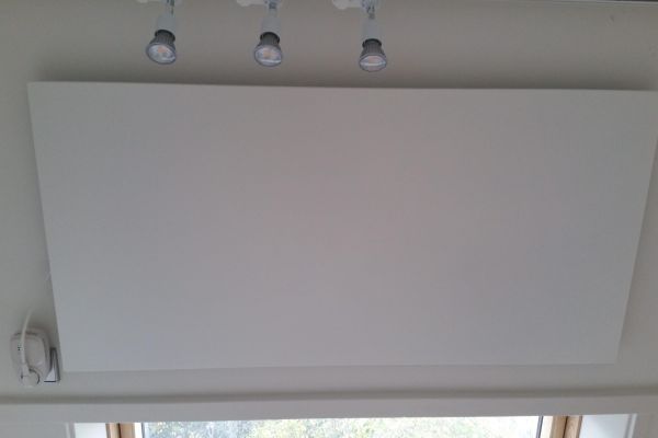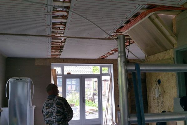 Het huis wordt verwarmd/gekoeld d.m.v. plafondverwarming in de woonkamer en in het werkhok. Een deel van de woonkamer heeft vloerverwarming. Op de zolder hebben we 2 infraroodpanelen.