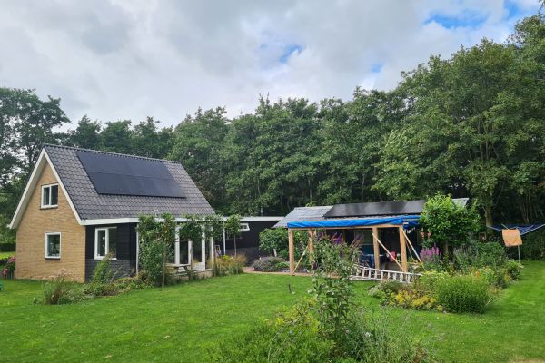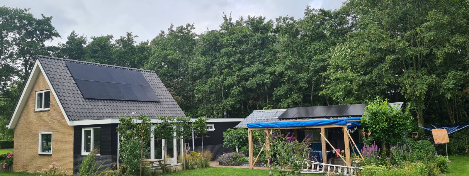 Zonnepanelen op de woning en op de schuur voor de elektriciteit. De energie van de panelen op de schuur gaat direct naar de thuisaccu.