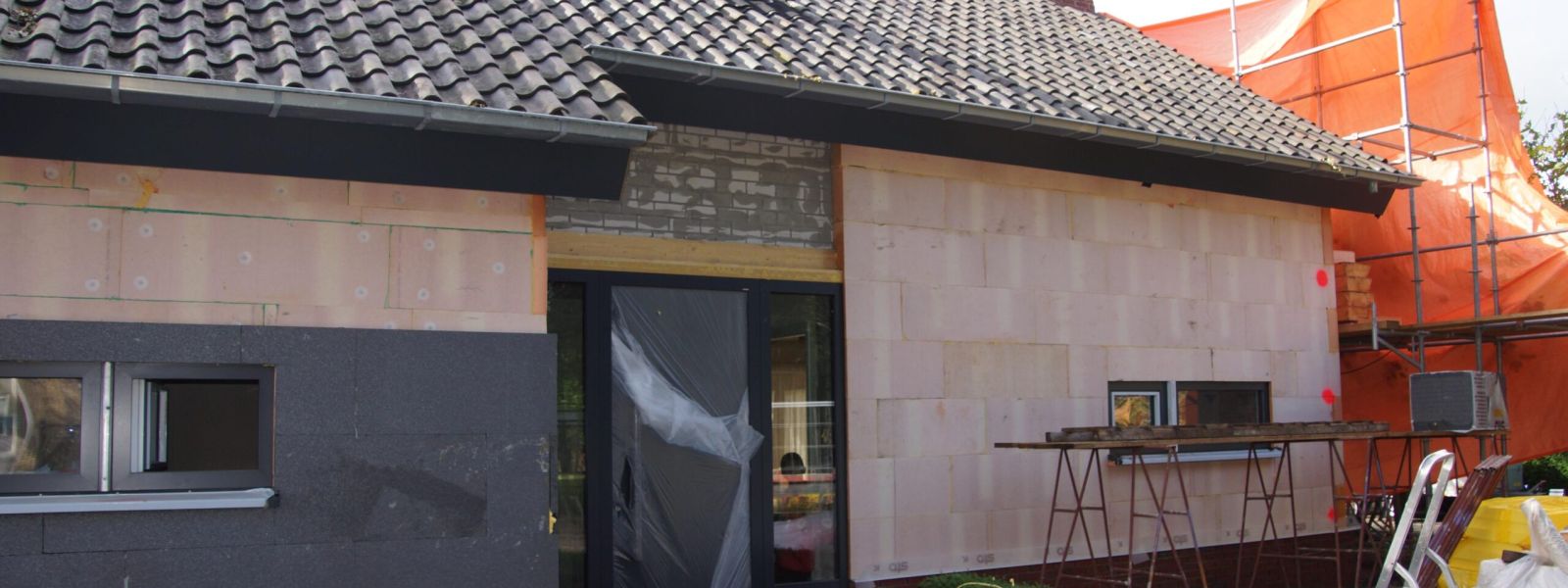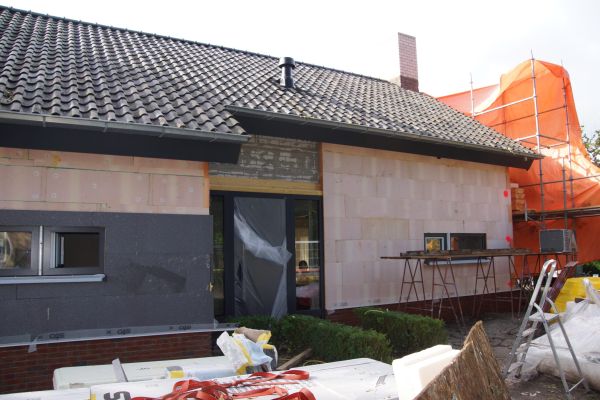 We zijn direct gestart om onze woning in eigen beheer om te bouwen naar een duurzame woning. Allereerst is de schil van de woning grondig aangepakt. Gekozen is daarbij o.a. voor 18 cm buitengevelisolatie (tot op de fundering), de plaatsing van goed isolerende kozijnen, ramen (triple glas) en deuren in de gevel, die met toepassing van stelkozijnen en dichtingsband luchtdicht in de gevel zijn geplaatst, vervanging van de vloeren en de complete vernieuwing van het dak door plaatsing van 28 cm passief huis dakplaten. Verder is nog een stukje groendak aangelegd. De energievoorziening wordt inmiddels verzorgd door 32 zonnepanelen, 4 zonnecollectoren gekoppeld aan een zonneboiler (500ltr) en een warmtepomp met 4 geboorde putten (100 mtr diep) voor bodemwarmte. In huis is ruimte gemaakt voor de benodigde installaties.