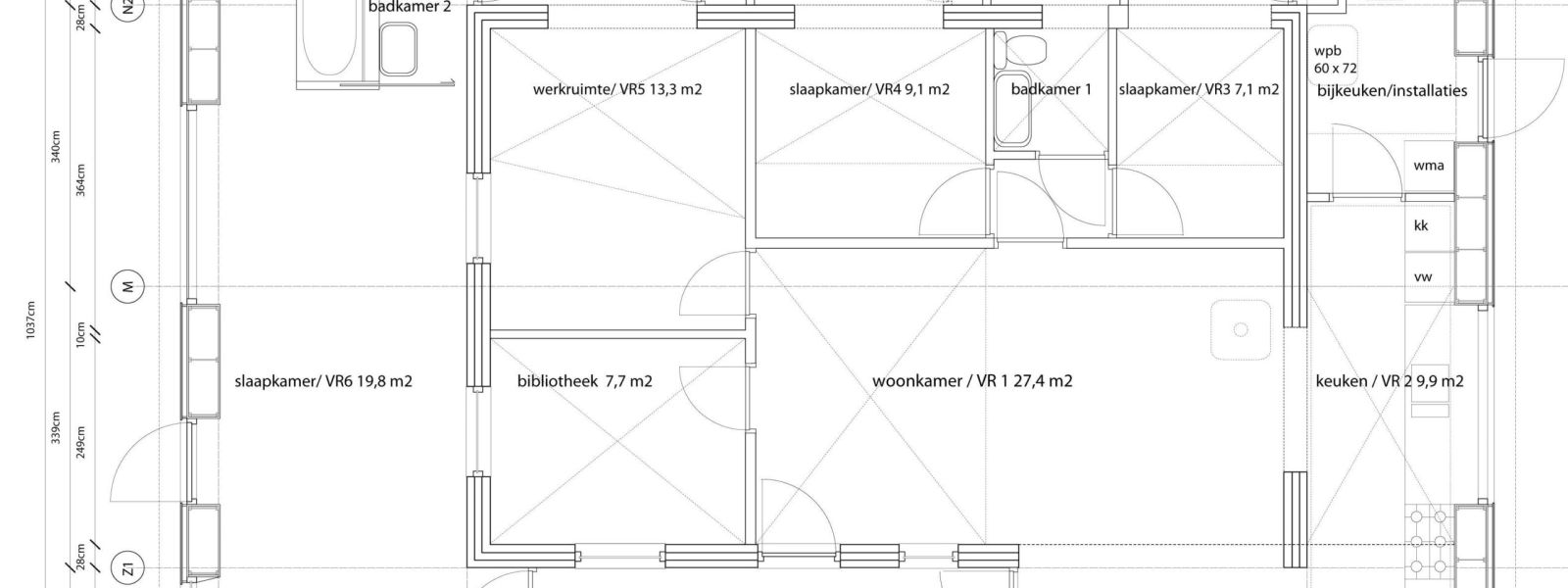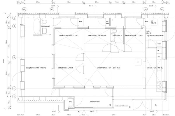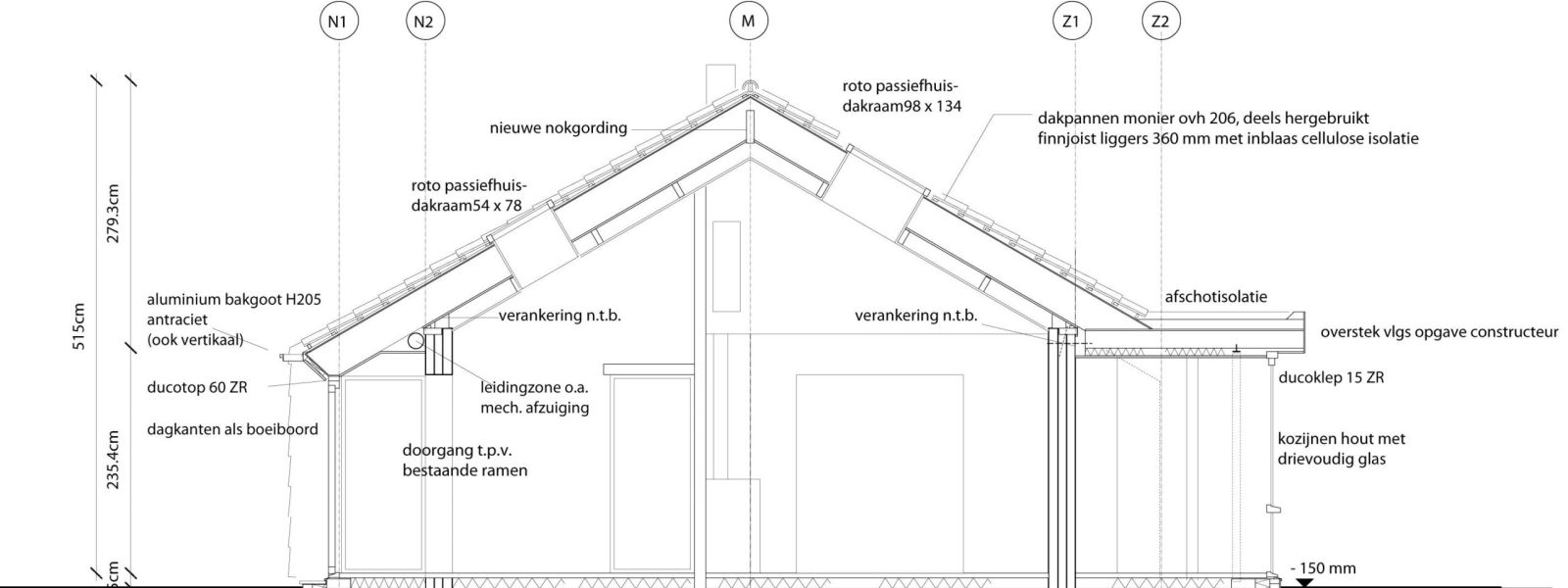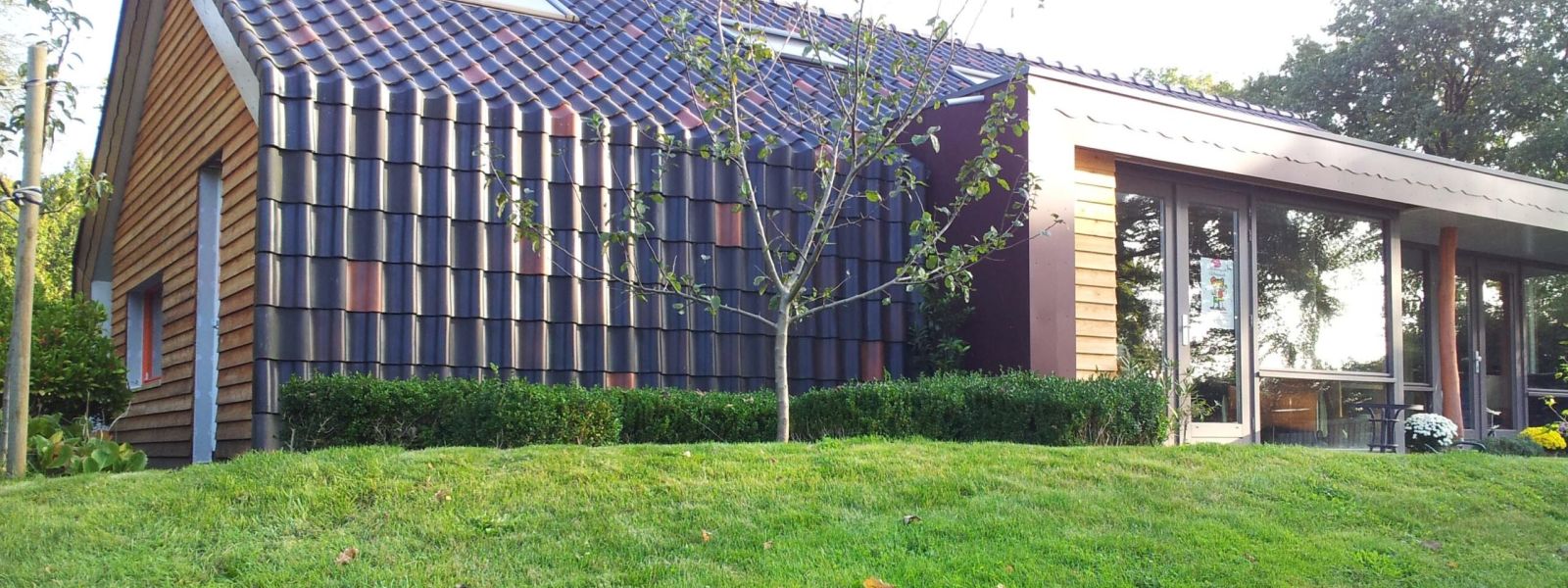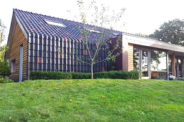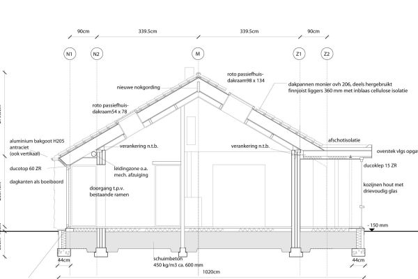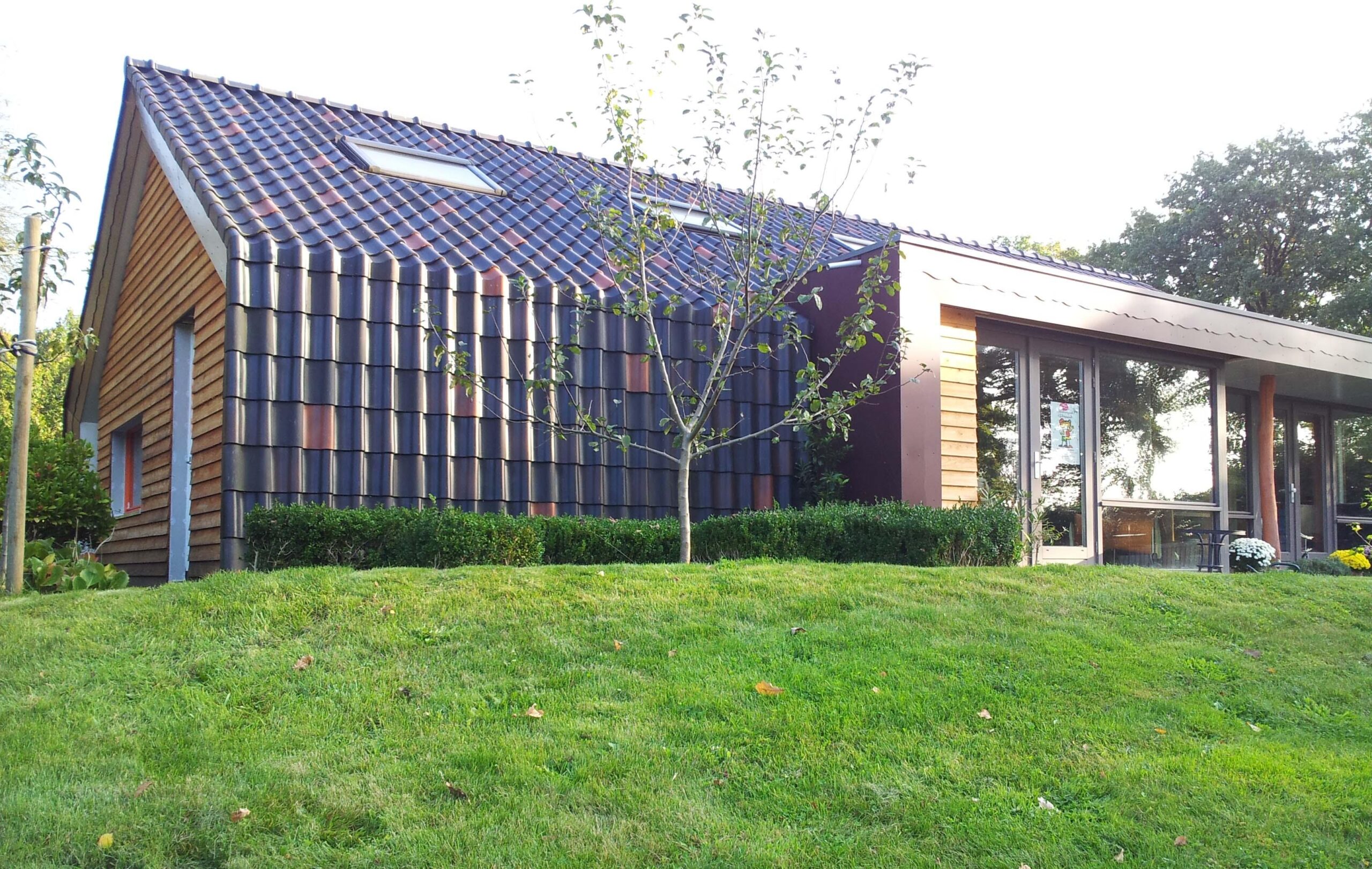Ons huis (warmejashuis) is een bungalow uit de jaren 60 waar we een goed geïsoleerde houtskeletbouw ‘jas’ overheen hebben laten bouwen. Het oude huis staat dus nog in het nieuwe. Zo hebben we veel bouwafval voorkomen en minder bouwmateriaal gebruikt. Door deze opzet is een een bijzonder en speels huis geworden.