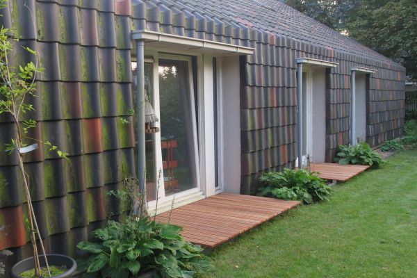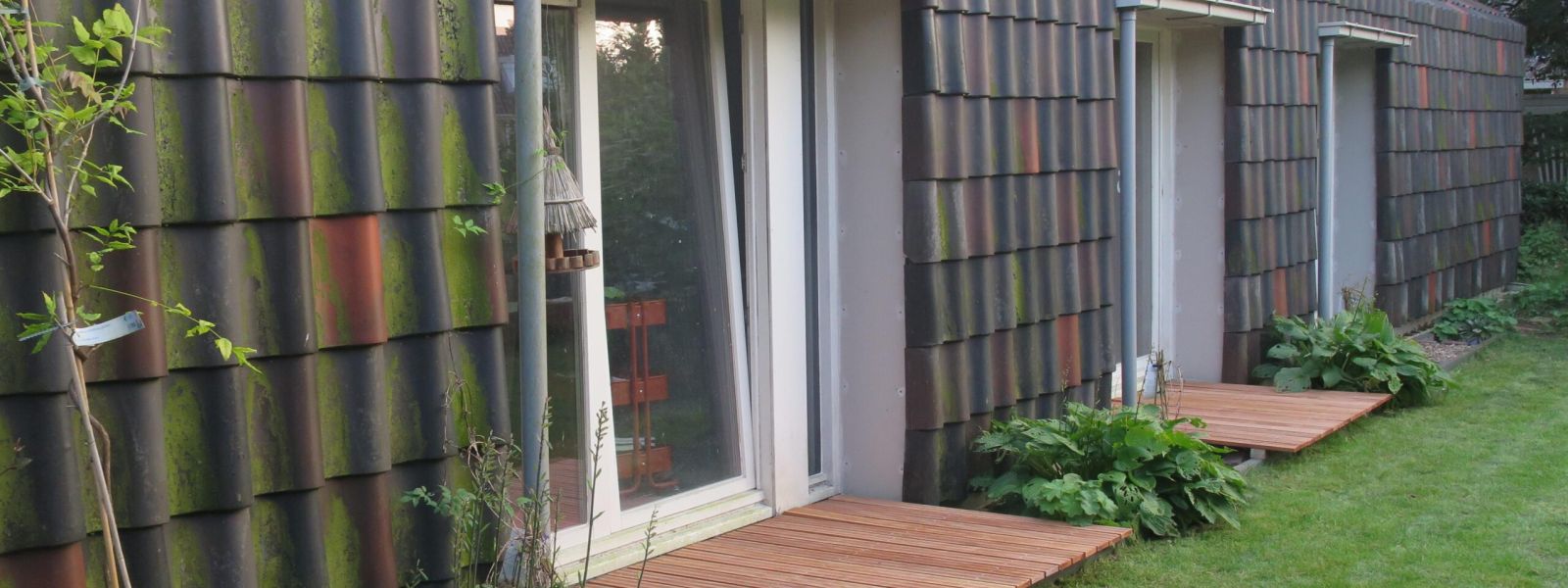 In de tuin hebben we hergebruikt bestratingsmateriaal, fsc houten vlonders, kastanjehouten afrastering van de moestuin.