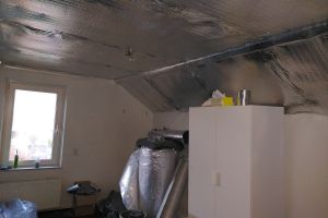 Voor de verhuizing begin 2018 hebben we een dunne geïsoleerde zwevende dekvloer met vloerverwarming laten plaatsen. Een bedrijf dacht met ons mee en had getest dat meerdere lagen radiatorfolie zeer goed isoleerde en reflecteerde. Totale nieuwe vloer is maar 5 cm dik. Het werkt goed en warmt lekker snel op bij 30 graden aanvoer temperatuur. Al was de droogtijd van de vloer wat lang in de winter!