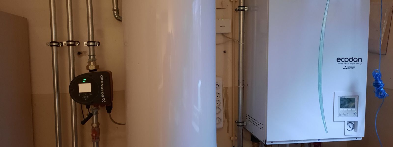 Binnendelen van de warmtepomp: De binnendelen van de warmtepomp bestaan uit een (rechthoekige) Ecodan Hydrobox en een buffervat van 100 liter. Het buffervat is nodig om de warmtepomp rustig en zuinig te laten draaien.