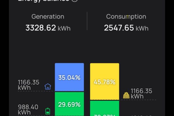 Onze woning is in april 2023 voorzien van 14 zonnepanelen van 420 Wp met een Huawei 5 kW 3-fase omvormer. Dit jaar in mei is hieraan toegevoegd een EcoFlow 10 kW omvormer met 10 kWh opslagcapaciteit in thuisbatterijen. Van mei 2025 tot nu hebben we maar 14% van onze totale energiebehoefte ingekocht. Verder is onze woning voorzien van noodstroom tot een vermogen van 6,6 kW en zolang de batterij voldoende capaciteit heeft. De noodstroom schakelt bijna onzichtbaar, namelijk onder de 30 ms de woning vrij van het net.