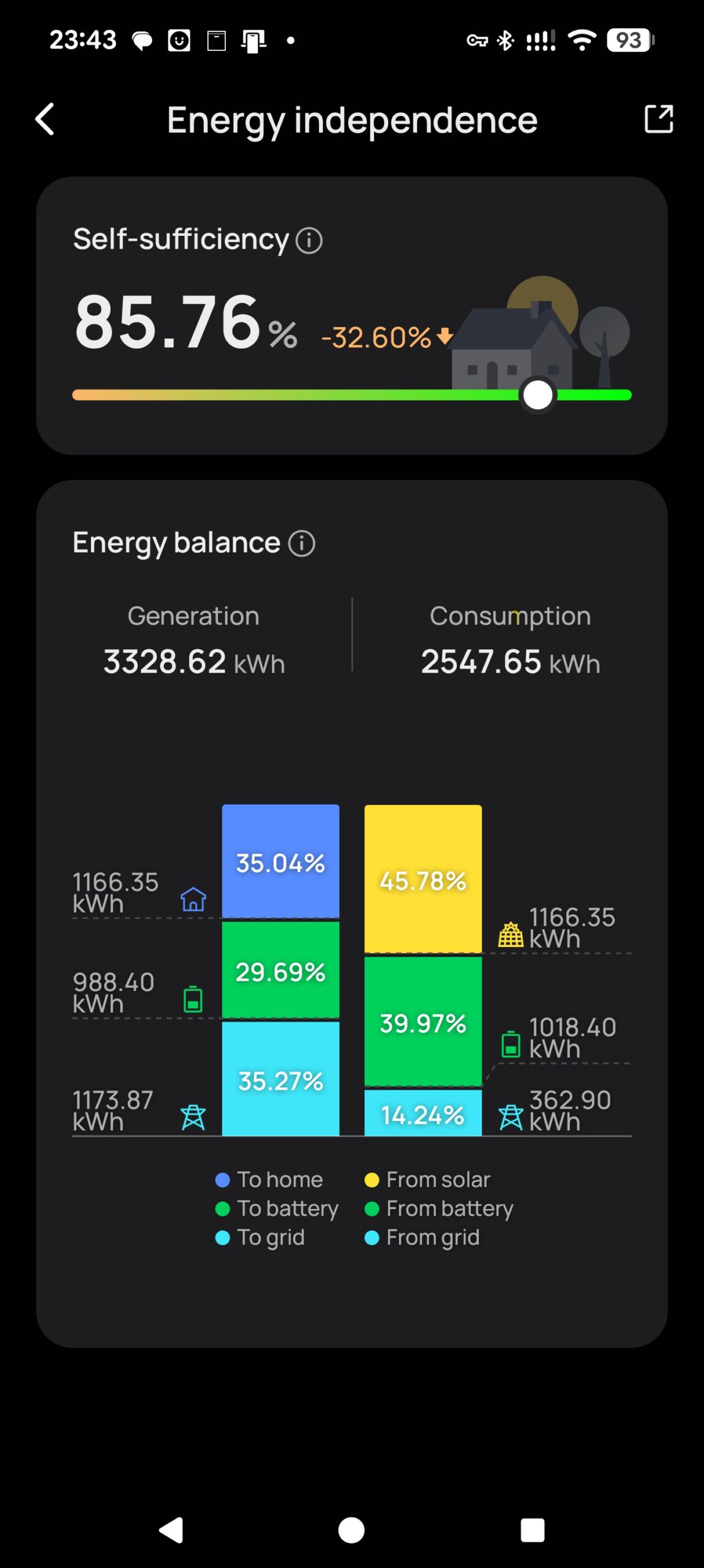 Onze woning is in april 2023 voorzien van 14 zonnepanelen van 420 Wp met een Huawei 5 kW 3-fase omvormer. Dit jaar in mei is hieraan toegevoegd een EcoFlow 10 kW omvormer met 10 kWh opslagcapaciteit in thuisbatterijen. Van mei 2025 tot nu hebben we maar 14% van onze totale energiebehoefte ingekocht. Verder is onze woning voorzien van noodstroom tot een vermogen van 6,6 kW en zolang de batterij voldoende capaciteit heeft. De noodstroom schakelt bijna onzichtbaar, namelijk onder de 30 ms de woning vrij van het net.