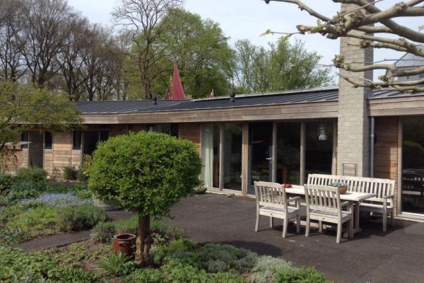 Alles gelijkvloers, zuidgericht, in 1987 al energiebesparende maatregelingen genomen, waaronder drie lagen glas en veel isolatie. Later zonnepanelen en zonneboiler aangebracht, schelpenlaag in kruipruimte, accumulerende kachel (hout). Sedumdak op de garage, later bijgebouwde bad- en slaapkamer vervaardigd met natuurlijke materialen, leemstuc en tadelakt.