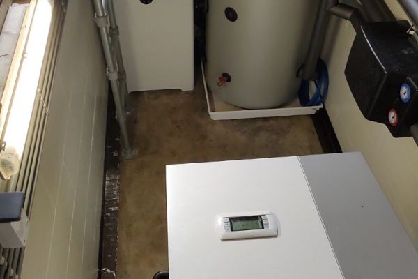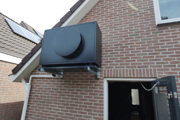 Warmtepomp met standaard radiatoren. Deze zijn voorzien van extra convectorventilatoren die de afgiftecapaciteit van de radiatoren verhogen.