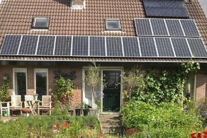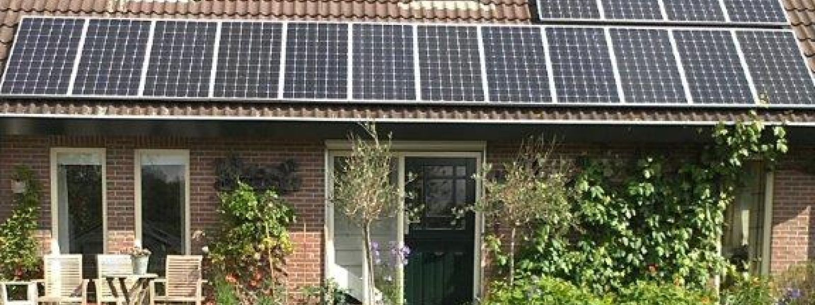 Op het schuine dak totaal 3040 Wp en 2000 Wp in het weiland.