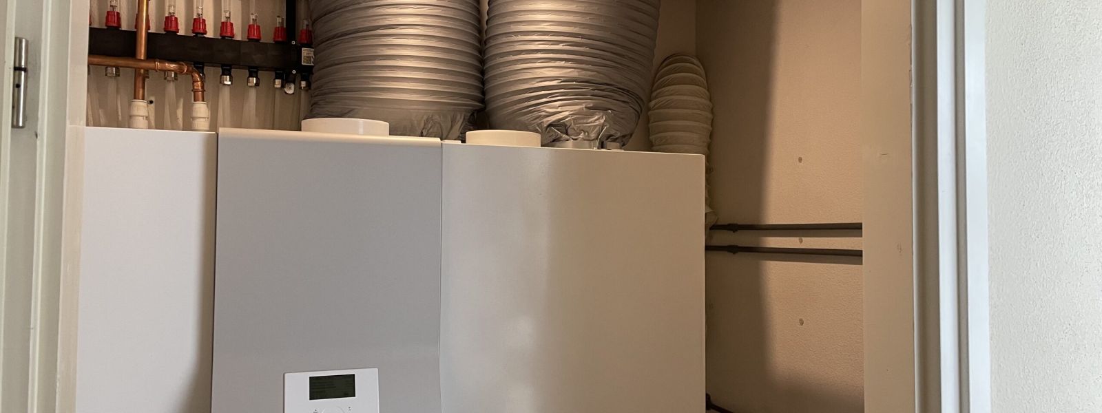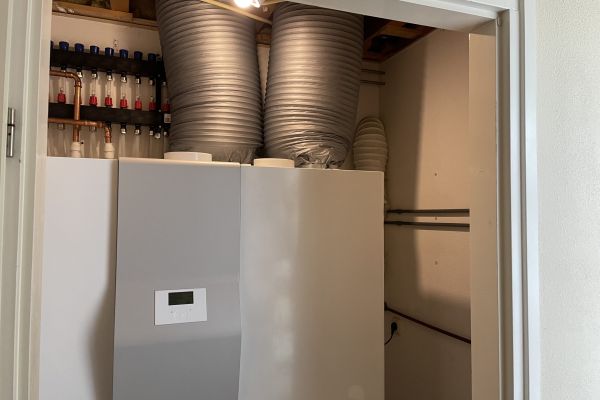 In de warmtepomp unit bevindt zich WTW met na verwarming. Woning is voorzien van slangen voor alle ruimtes