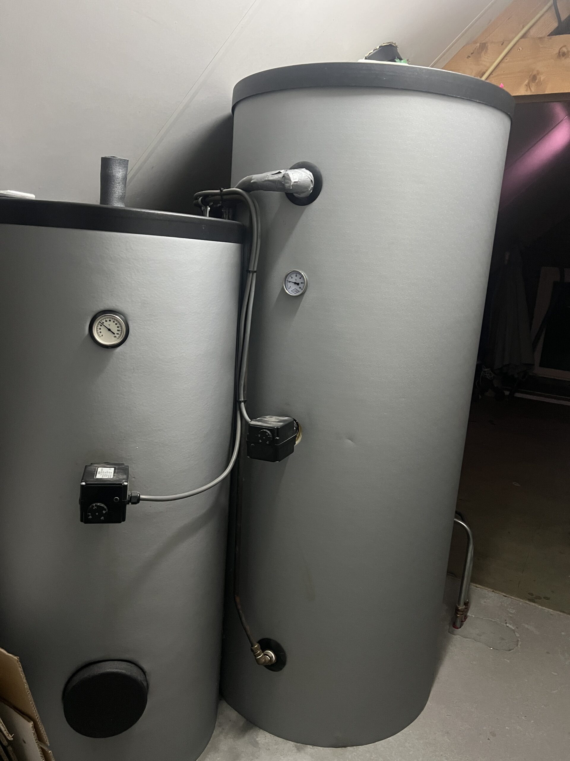 De houtkachel verwarmt niet alleen de woonkamer, maar ook het buffervat, waardoor de warmte in de hele woning wordt verspreid.