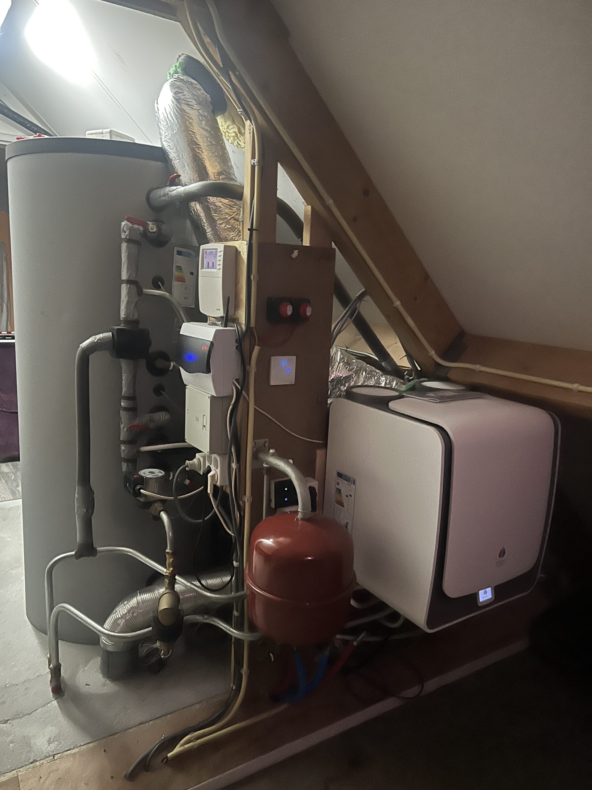 De woning wordt verwarmd met een spaarpomp die warmte terugwint uit de ventilatielucht en deze gebruikt voor de vloerverwarming. Bij strenge kou kan de pelletketel extra warmte leveren. In het voor- en najaar helpt de zonneboiler mee om het huis te verwarmen.