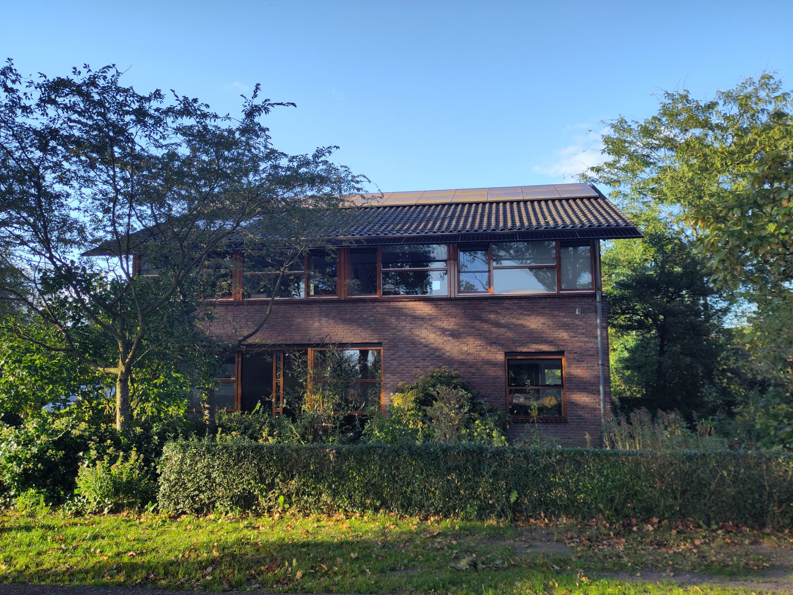 Bij renovatie van het dak van het bijgebouw zorgen Solinso zonnepanelen (10 kWpiek) rechtstreeks op het isolatiepakket gemonteerd als dakbedekking. Aan de randen afgewerkt met pannen op de gevel en in de kielgoot. Incidentele verwarming van de werkplek in de werkplaats gebeurt met een infrarood paneel.