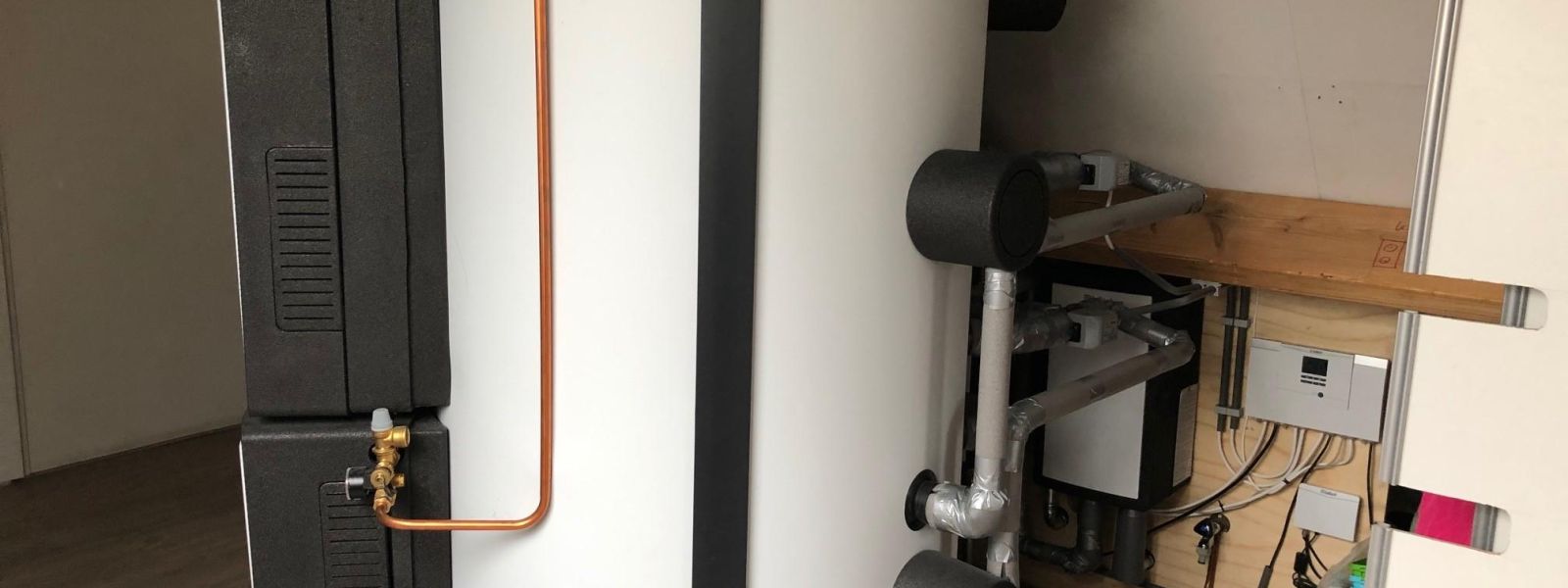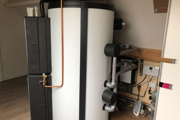 Er is een groot buffervat die opgewarmd wordt door 3 zonnecollectoren alsmede een luchtgekoelde warmtepomp. Het onderste (minder warme) deel van het buffervat verzorgd de verwarming van het woonhuis; het (warme) bovenste deel van het buffervat verzorgd het warm tapwater.