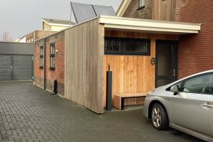 Garage/berging is omgebouwd tot badkamer , een aanbouw is op de begane grond gerealiseerd. We slapen nu nog op de 1ste verdieping, maar als we slechter ter been worden gaan we daar slapen. We kunnen daardoor tot hele hoge leeftijd hier blijven wonen.