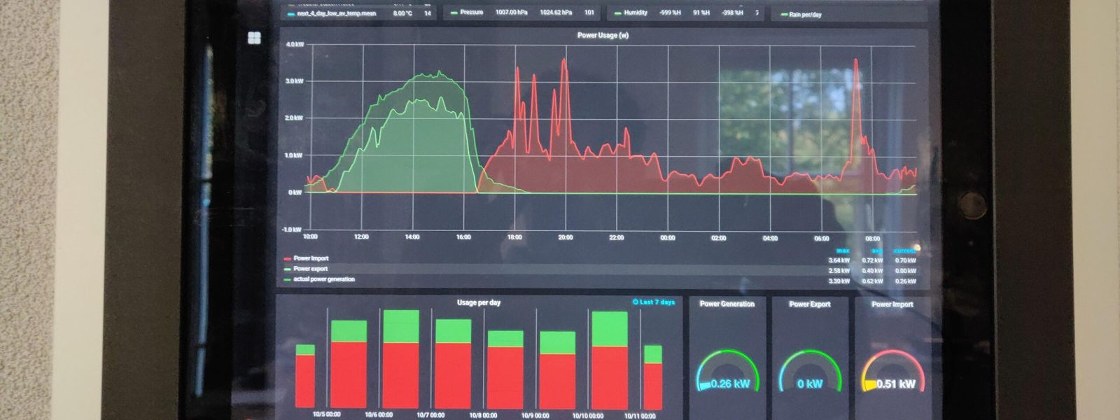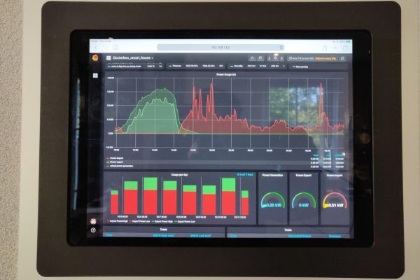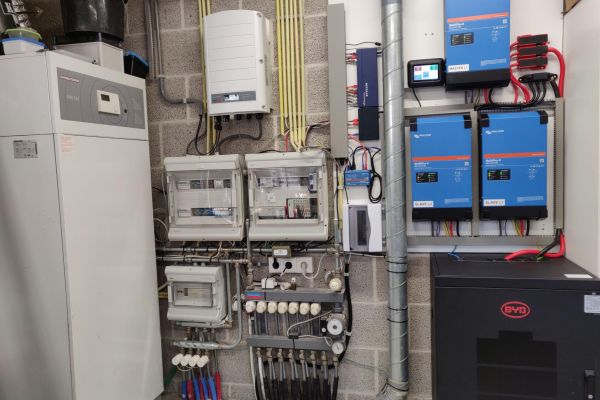 Volledig automatische woning met comfort en energiezuinig als uitgaanspunten. 27 zonnepanelen vullen overdag een 10kwh accu, de surplus van de zon wordt automatisme naar 1 van 2 volledige elektrische auto’s gestuurd. In de avond ontlaadt de accu tot ongeveer 2uur ’s nachts totdat de accu leeg is.