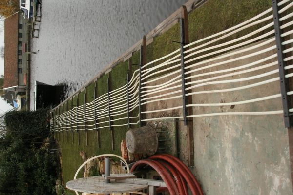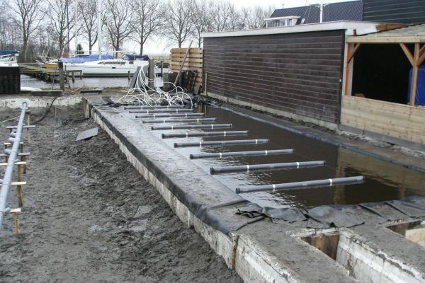 Is de temperatuur van het oppervlakte water gedaald naar 10° C dan schakelen we over op de warmtebuffer. De buffer is 105.000 liter groot (zie foto’s) en gevuld met (oppervlakte) water. De bruikbare en gemeten warmte inhoud van de buffer is op dit moment meer dan 2000 kWh bij een afname van 16 graden (van 25° C naar 9° C). Deze 2000 kWh hoeft de warmtepomp dus minder op jaarbasis te produceren.