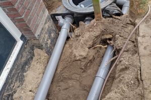 Met een DAB pomp wordt het water naar de wasmachine op zolder en toilet gepompt via apart aangelegde leidingen door de centrale schacht in huis.