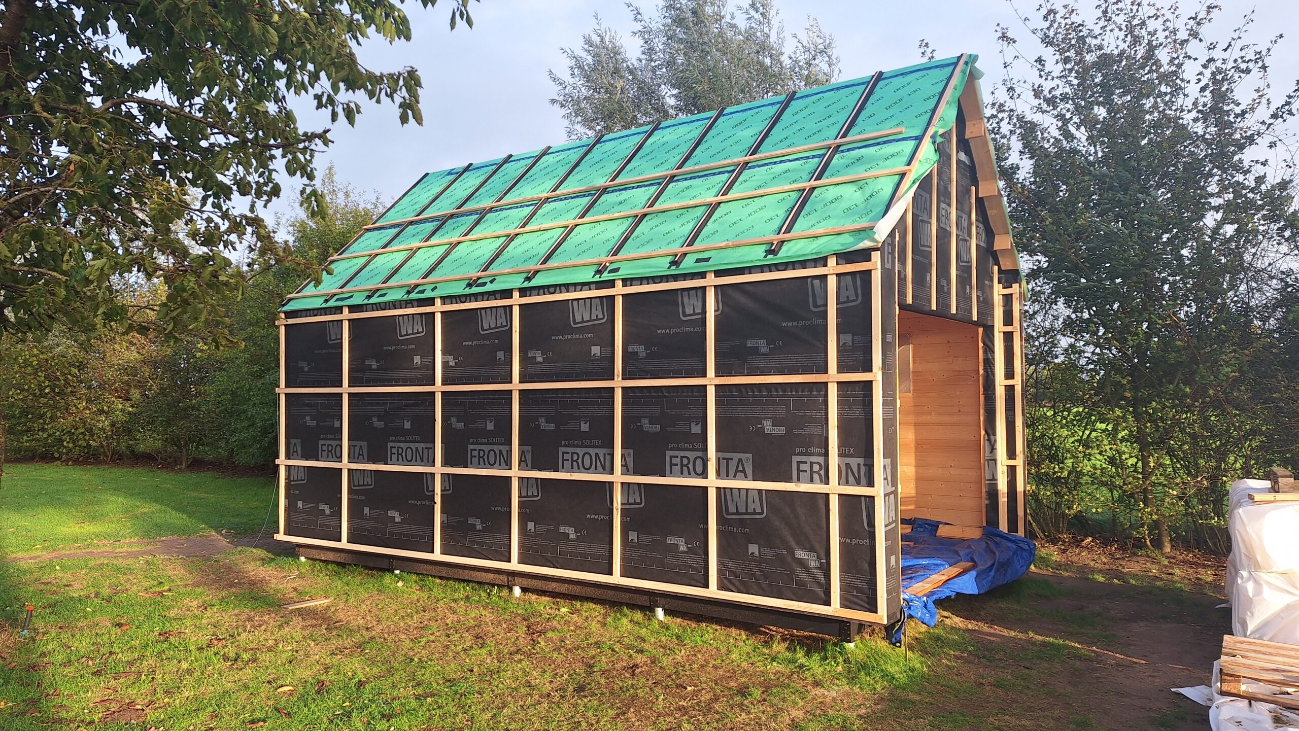 Sinds de zomer van 2025 bouwen we aan een houten tuinhuis, damp-open, bio-based en off-grid.