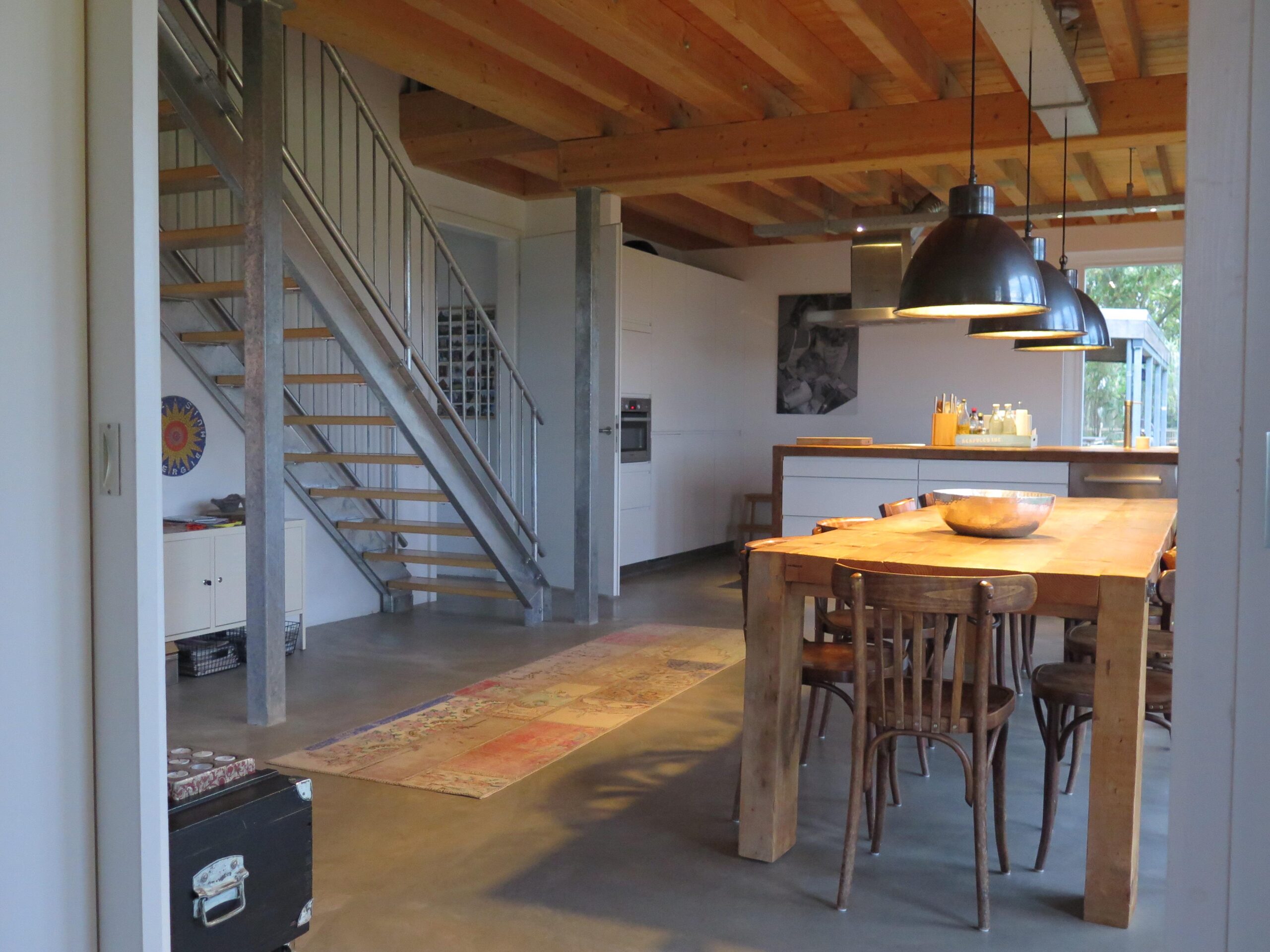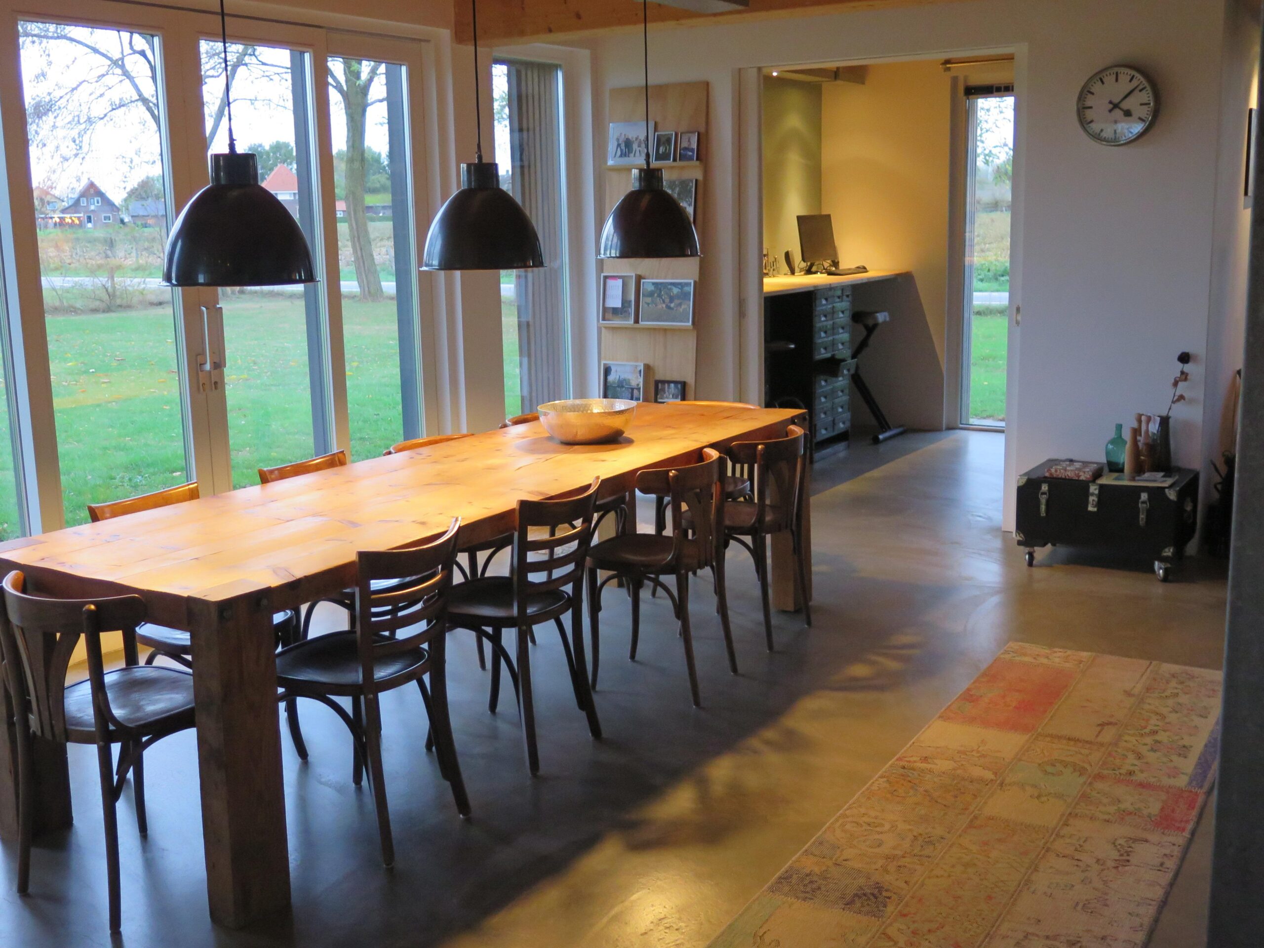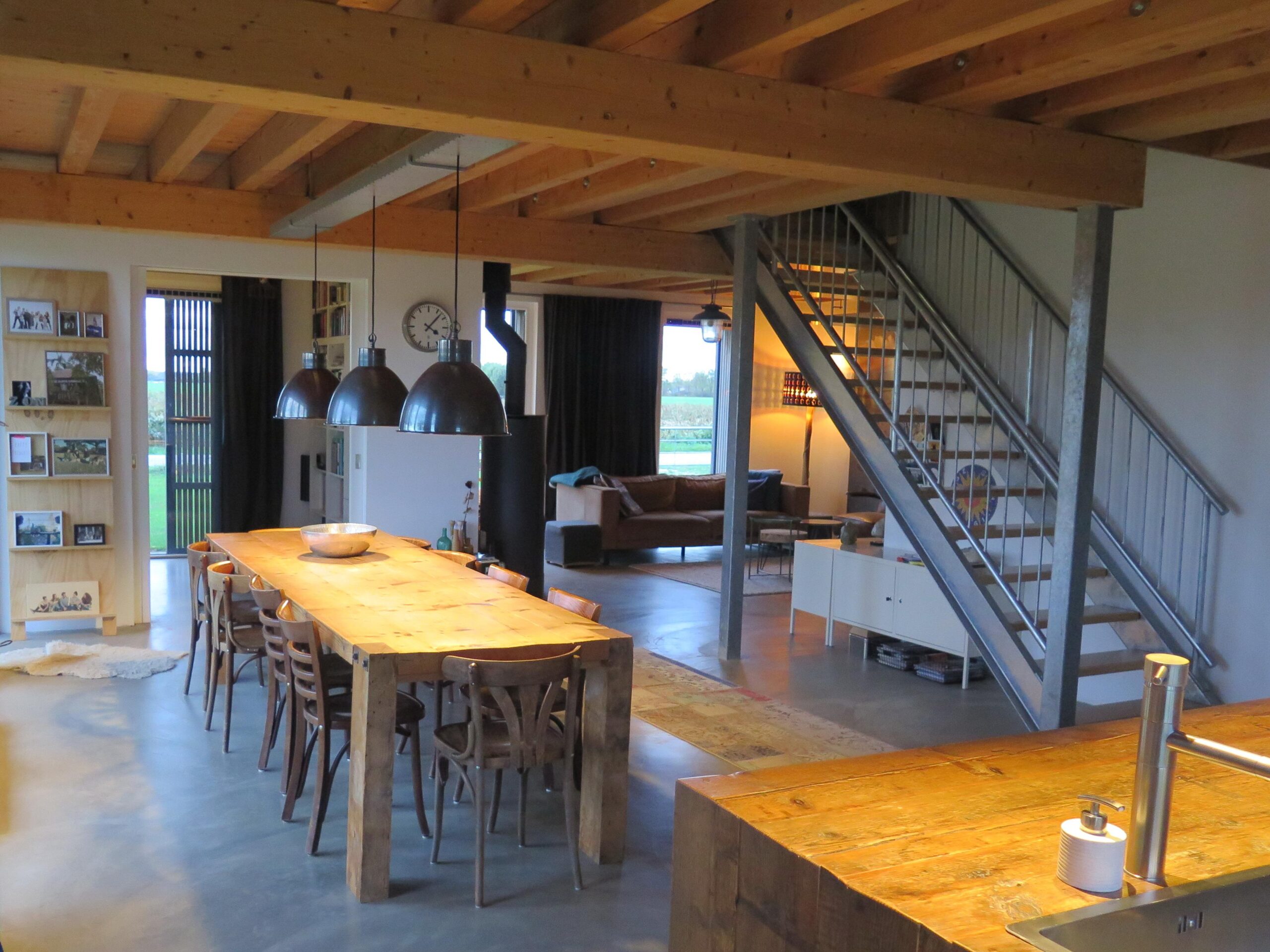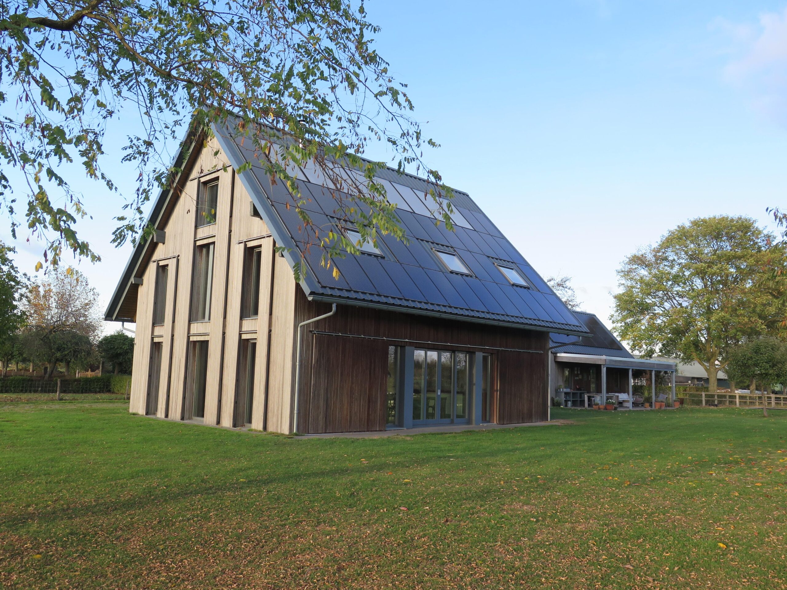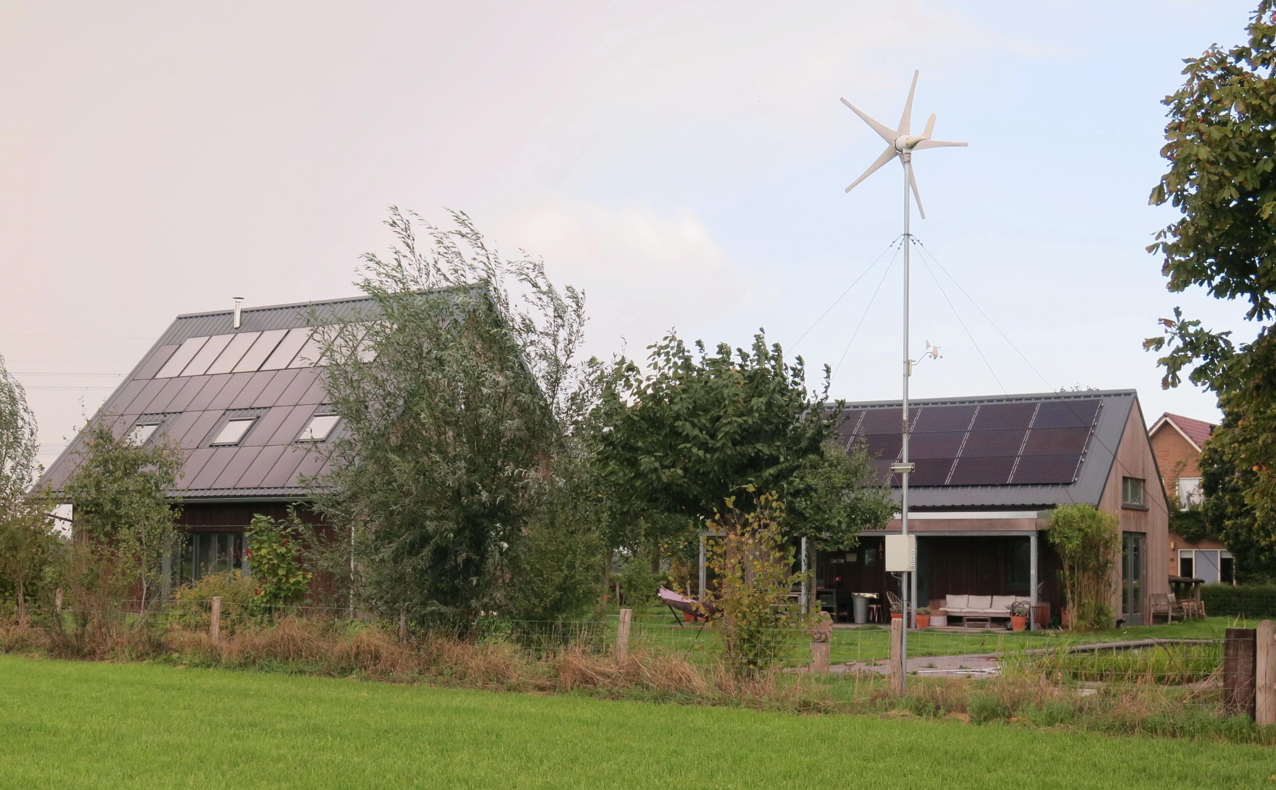 In 2010 was het onze ambitie om een duurzaam en energieneutraal huis voor ons gezin te bouwen. Uitgangspunten voor de bouw was dat er zoveel mogelijk gebruik gemaakt zou worden van duurzame materialen en dat het energieverbruik en de energie-opwek over een heel jaar gezien netto in evenwicht zou zijn of dat we meer energie zouden opwekken dan verbruiken. Voor de energiebalans zou gebruik gemaakt moeten worden van passieve en actieve energieconcepten. De basis van het energieneutraal concept is zeer goede isolatie en tochtdichtheid van het huis en de zon-gerichte oriëntatie van de woning. Hierdoor wordt optimaal van de directe warmte van de zon gebruik gemaakt en wordt verlies van energie maximaal beperkt. Via de open zuidzuidoost gevel komt er in de winter veel zonlicht en daarmee warmte binnen. In de zomer wordt de zon buiten gehouden door het dakoverstek en de in het ontwerp geïntegreerde buiten-zonwering bestaande uit houten luiken. Het huis is gebouwd op basis van houtskeletbouw met gebruik van uitsluitend FSC/PEFC gecertificeerd hout. Het casco van het huis is op basis van onze tekeningen in een fabriek gebouwd, en eind 2010 in 6 dagen op locatie in elkaar gezet. Daarna is de afwerking binnen en buiten in 5 maanden afgemaakt. Regenwater wordt opgevangen in een grijswatersysteem en wordt gebruikt voor doorspoelen van de toiletten. Voor de energievoorziening wordt gebruik gemaakt van een elektrisch en thermisch systeem. Op het zuidzuidoost-gerichte dak van het huis en van de schuur liggen foto-voltaïsche (PV) en thermische panelen om zonne-energie in de vorm van elektriciteit en warmte vast te leggen. De door de PV panelen opgewekte elektrische energie wordt gebruikt voor gebouw-gebonden systemen, voor elektrisch vervoer, en voor alle overige apparaten in huis. Het overschot van gemiddeld 2.000 kWh per jaar wordt terug geleverd aan het elektriciteitsnet. De door de thermische panelen opgewekte warmte wordt opgeslagen in een buffervat met 2.000 liter water. Dit is de warmtebron voor de vloerverwarming en de warm water voorziening. Van april tot en met oktober is de zon krachtig genoeg dat er geen enkele andere warmtebron nodig is. In de winter houdt de brine-water-warmtepomp het buffervat op temperatuur voor warm douchewater en de vloerverwarming. De warmtepomp gebruikt de aarde met drie diepteboringen van 100 meter als warmtebron. Om energieverlies via ventilatielucht te beperken is een vraag-gestuurd ventilatiesysteem geïnstalleerd. We hebben 8 jaar een kleine windmolen bij het huis gehad (zie foto), maar dat levert helemaal geen bijdrage aan de energievoorziening. Met dit type windmolen en locatie in het oosten van het land is het verbruik van de omvormer over het hele jaar heen net zo hoog als de opbrengst de windmolen wanneer het voldoende hard waait om energie op te wekken. Een recente storm heeft een einde aan het windmolenavontuur gemaakt.