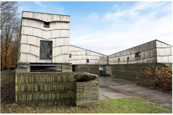 Zeer duurzaam, bijna zelfvoorzienend woonhuis. Veel zonnepanelen, zonnecollectoren, warmtepomp en 1.000 liter buffervat, CV haard, kookfornuis op hout voor de winters. Eigen waterbron en zuiveringsinstallatie, helofytenfilter voor het afvalwater. Het woonhuis is alleen aangesloten op het elektriciteitsnet en de glasvezelkabel, verder volledig off-grid. Het exterieur is op enkele onderdelen als glas en kozijnen na volledig opgetrokken uit hergebruikte materialen als steenschotten en oude trottoirtegels. Ook in het interieur zeer veel hergebruikte materialen (dekzeil vrachtwagens in plaats van wandtegels, verkeersborden voor de keuken, parachutes als gordijnen, enz.) waardoor het woonhuis een zeer lage CO2 footprint heeft.