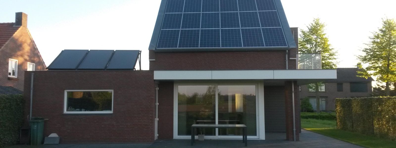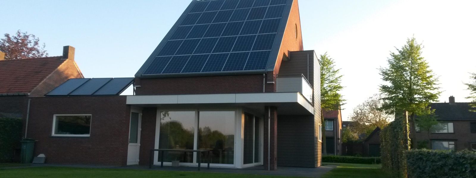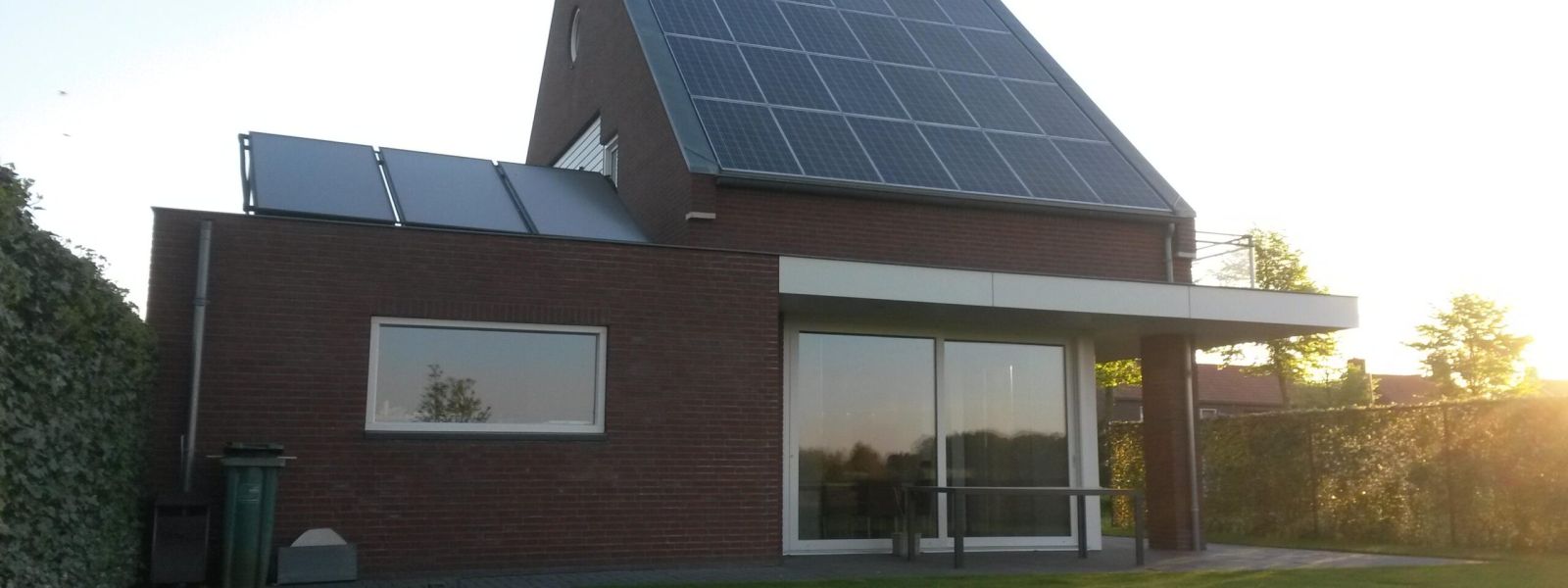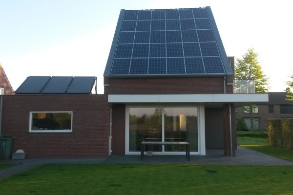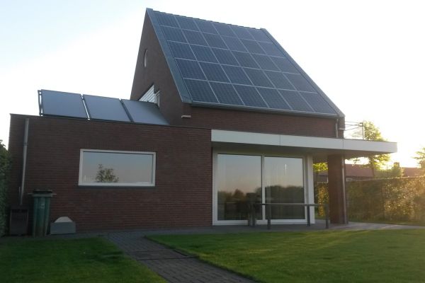 In 2012 nieuw gebouwde woning (houtskeletbouw) met zonnepanelen, warmteboilers en warmtepomp.